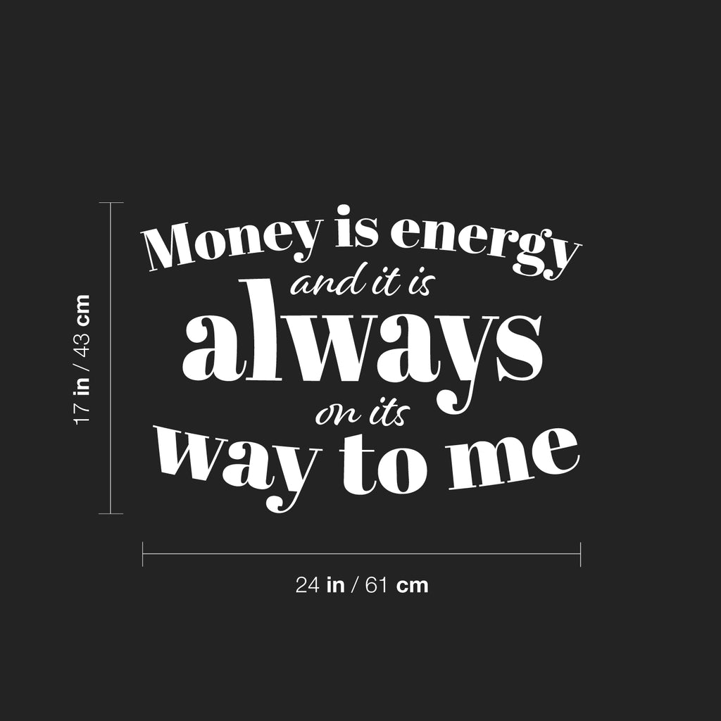 This modern decal quote "Money Is Energy And It Is Always On Its Way To Me"; is the perfect touch for your office. Use it for your coffee shop; storefront or anywhere you want to bring some extra positive decoration. It's a vinyl sticker that is easy to put on any smooth and dry surface. Our modern designs don't just brighten up the room; but brighten up the day. Using top of the line vinyl across all of our production allows us to be the leaders in quality and design.