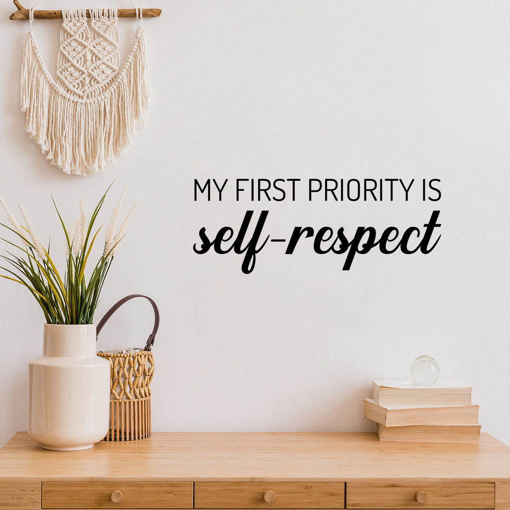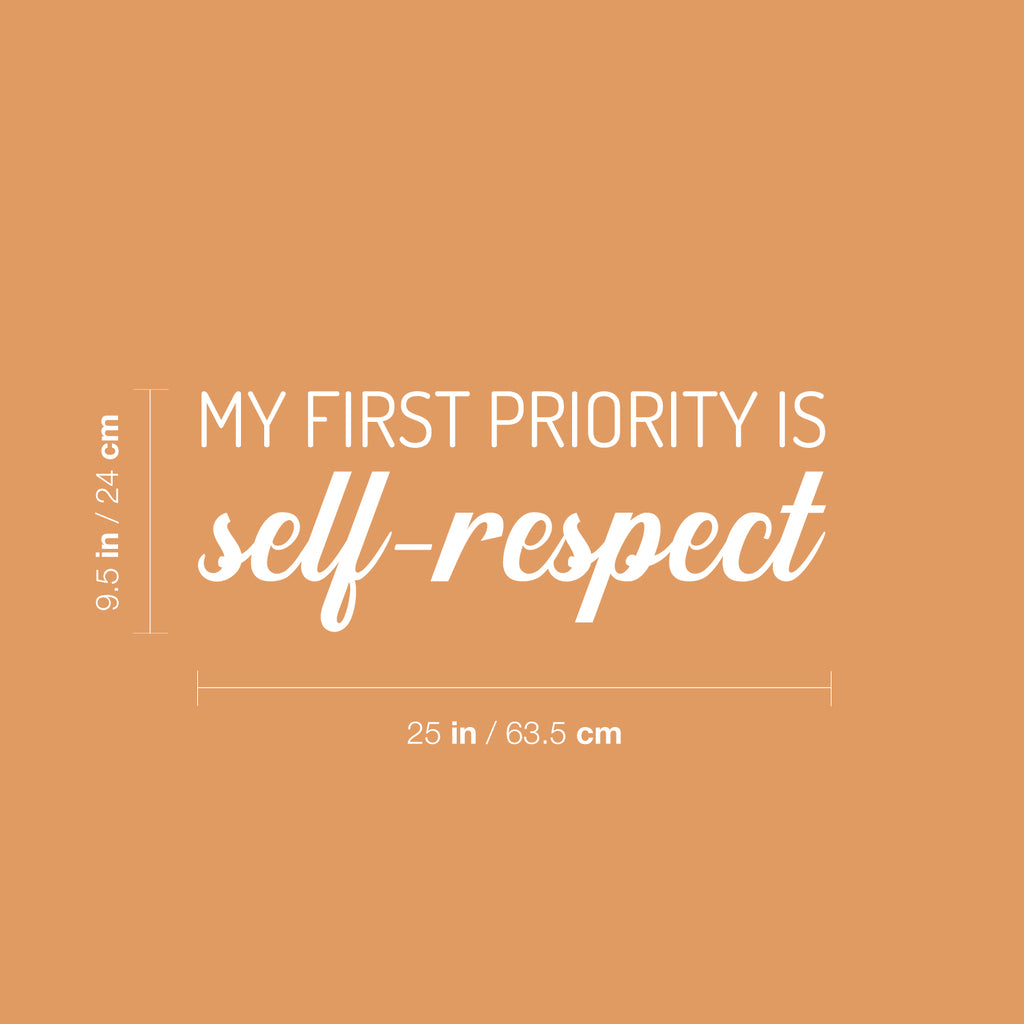 This great decal quote "My First Priority Is Self-Respect"; is the perfect touch for your home. Use it for your makeup area; dorm room or anywhere you want to bring some extra decoration. It's a vinyl sticker that is easy to put on any smooth and dry surface. Our modern designs don't just brighten up the room; but brighten up the day. Using top of the line vinyl across all of our production allows us to be the leaders in quality and design.
