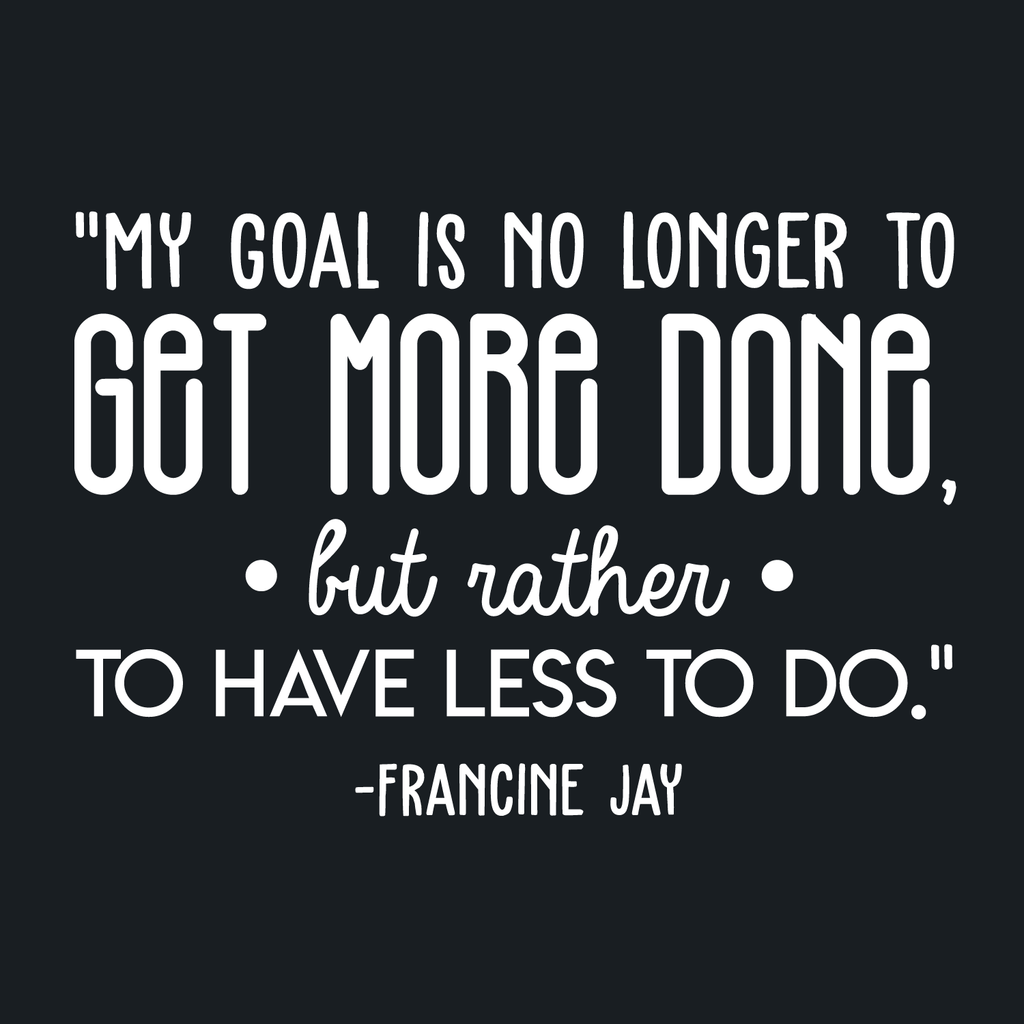This awesome positive decal quote "My Goal Is No Longer To Get More Done But Rather To Have Less To Do - Francine Jay"; is the perfect touch for your home or office. Use it for your bedroom; closet; living room or anywhere you want to bring some extra positive decoration. It's a vinyl sticker that is easy to put on any smooth and dry surface. Our modern designs don't just brighten up the room; but brighten up the day. Using top of the line vinyl across all of our production allows us to be the leaders in quality and design.
