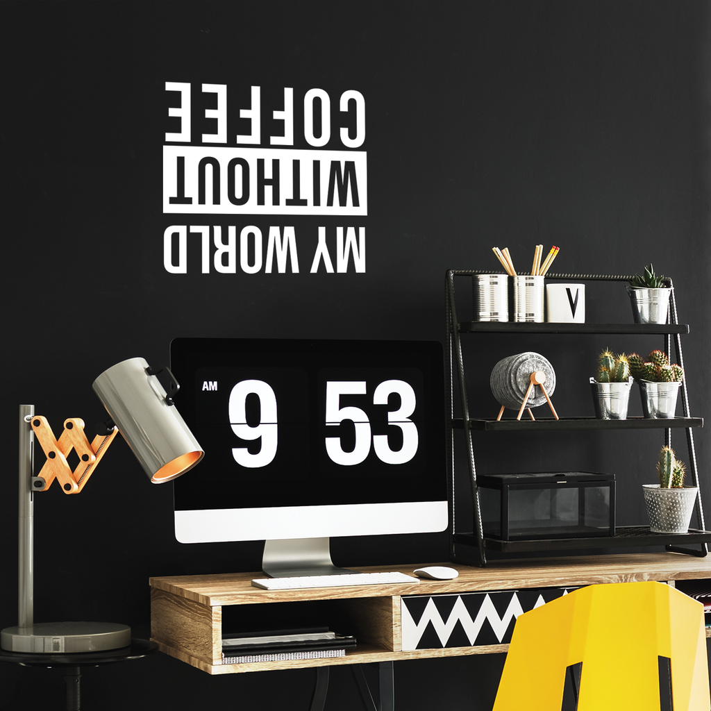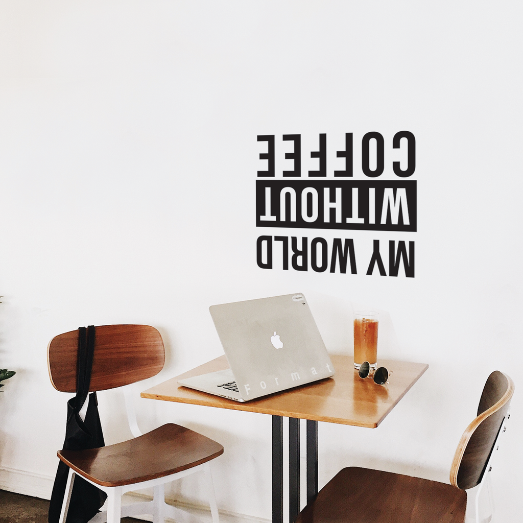 This awesome funny decal quote "My World Without Coffee"; is the perfect touch for your living room or coffee shop. Use it for your kitchen; dining room; office or anywhere you want to bring some extra decoration. It's a vinyl sticker that is easy to put on any smooth and dry surface. Our modern designs don't just brighten up the room; but brighten up the day. Using top of the line vinyl across all of our production allows us to be the leaders in quality and design.