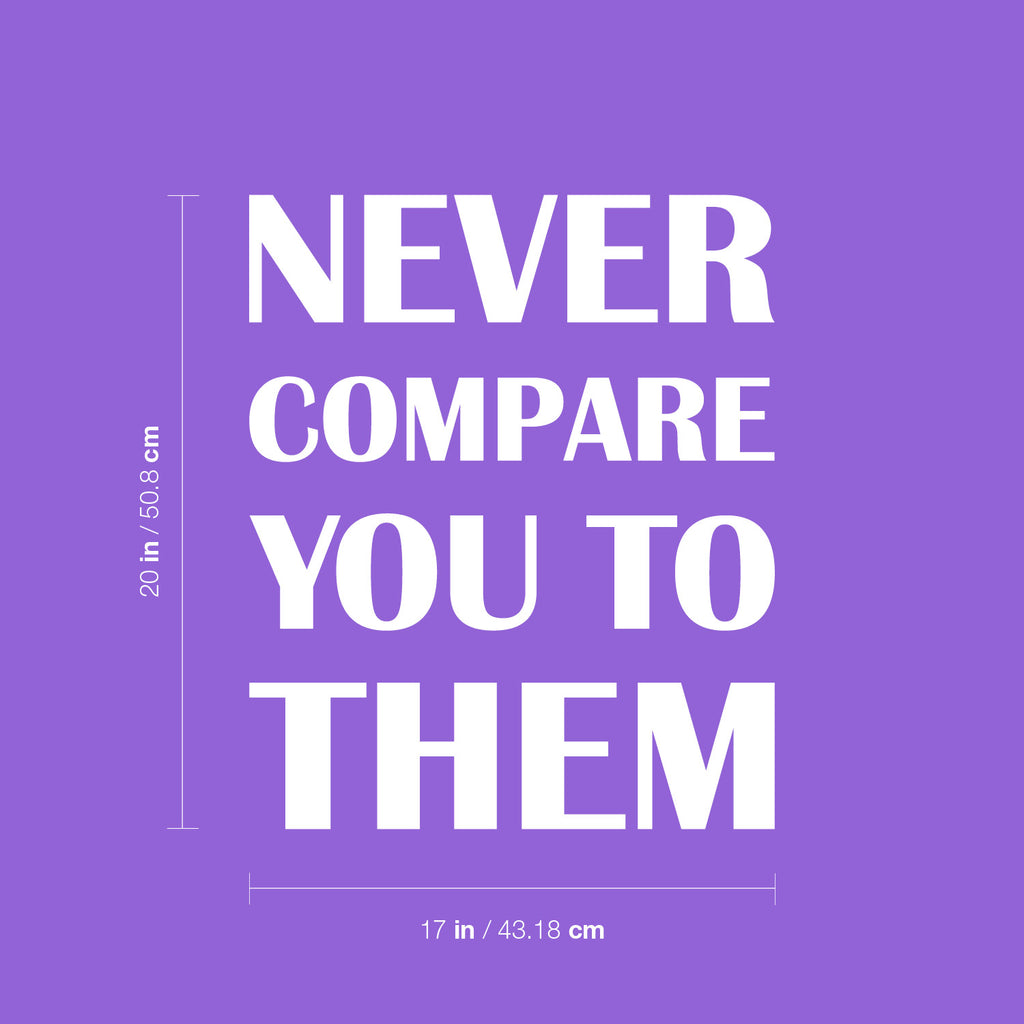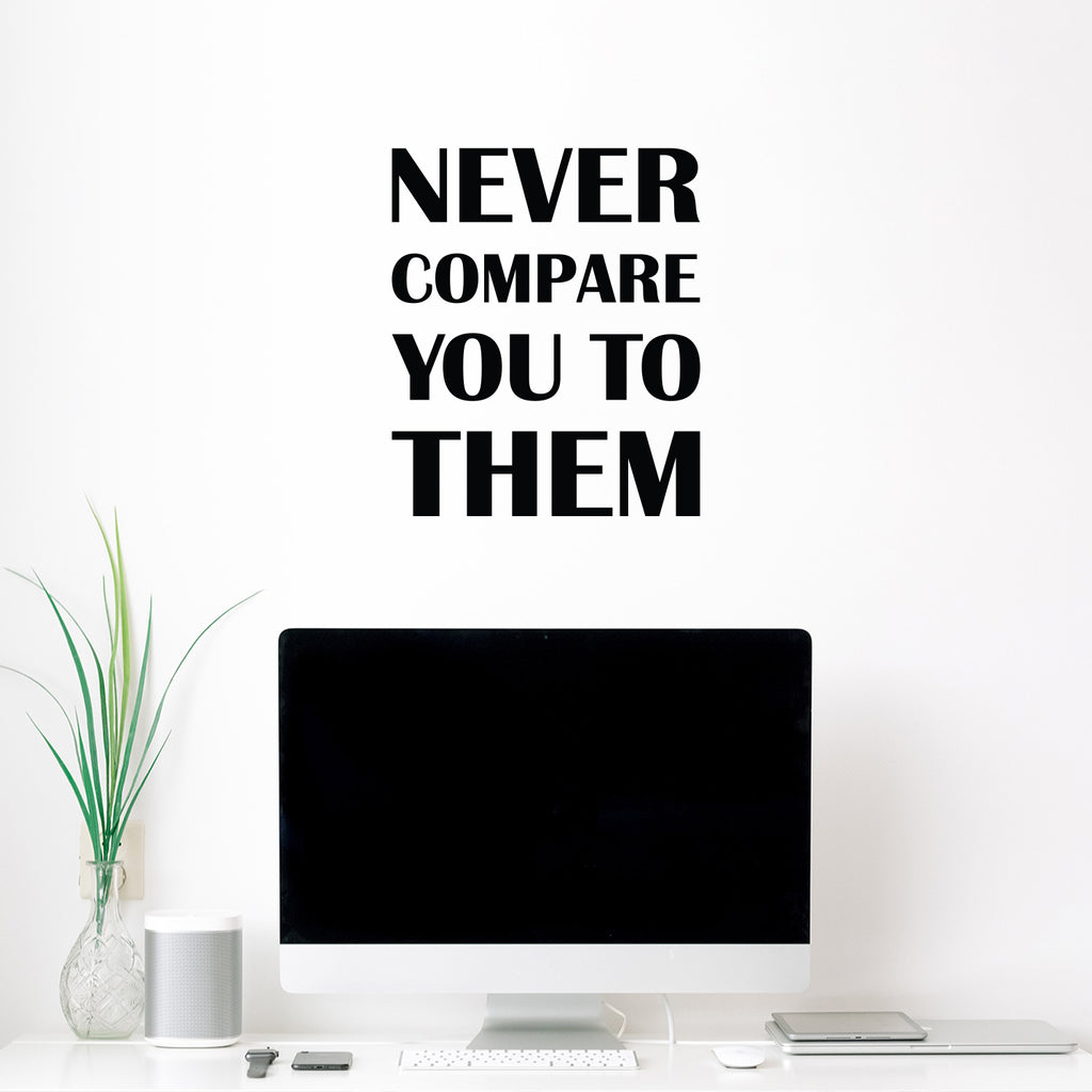 This modern positive & motivational decal quote "Never Compare You To Them"; is the perfect touch for your fitness center or home gym. Use it for your home; yoga classes; studio dance or anywhere you want to bring some extra positive decoration. It's a vinyl sticker that is easy to put on any smooth and dry surface. Our modern designs don't just brighten up the room; but brighten up the day. Using top of the line vinyl across all of our production allows us to be the leaders in quality and design.