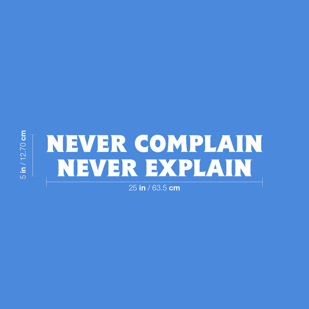 This awesome motivational & optimistic decal quote "Never Complain Never Explain"; is the perfect touch for your home or office. Use it for your living room; office; coffee shop or anywhere you want to bring some extra cute decoration. It's a vinyl sticker that is easy to put on any smooth and dry surface. Our modern designs don't just brighten up the room; but brighten up the day. Using top of the line vinyl across all of our production allows us to be the leaders in quality and design.