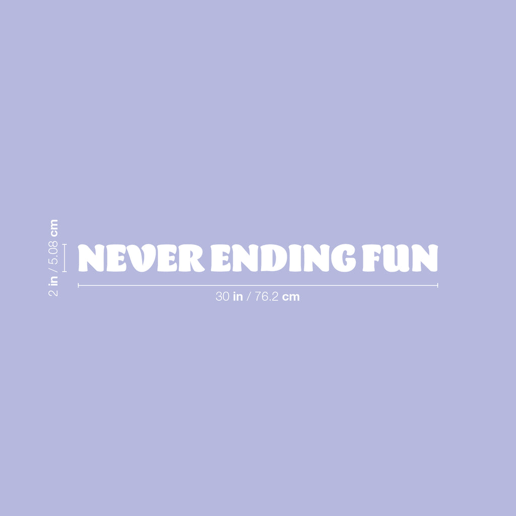 This awesome positive & funny decal quote "Never Ending Fun" is the perfect touch for your home or school. Use it for your bedroom; playroom; kids room or anywhere you want to bring some extra cute decoration. It's a vinyl sticker that is easy to put on any smooth and dry surface. Our modern designs don't just brighten up the room; but brighten up the day. Using top of the line vinyl across all of our production allows us to be the leaders in quality and design.
