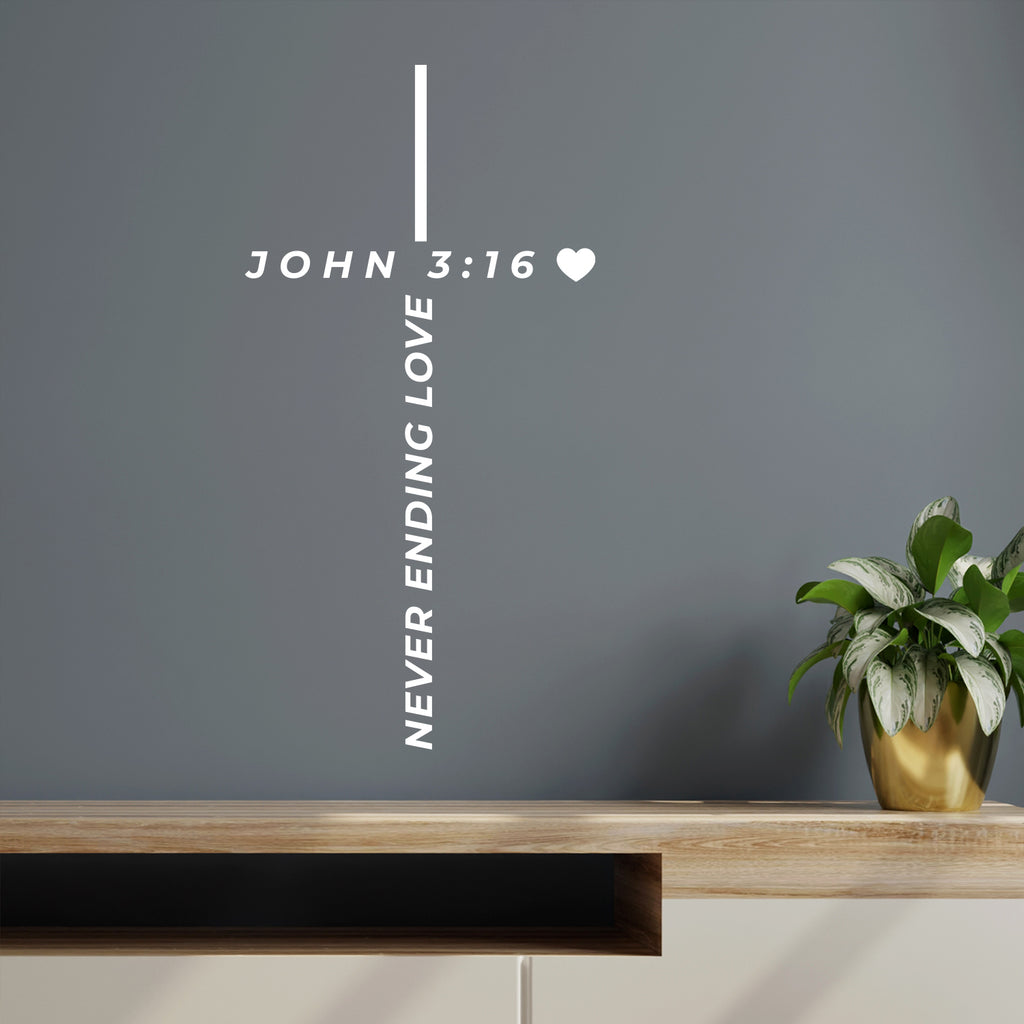 This spiritual & inspiring decal quote "Never Ending Love John 3:16"; is the perfect touch for your home. Use it for your office; living room or anywhere you want to bring some extra cute decoration. It's a vinyl sticker that is easy to put on any smooth and dry surface. Our modern designs don't just brighten up the room; but brighten up the day. Using top of the line vinyl across all of our production allows us to be the leaders in quality and design.