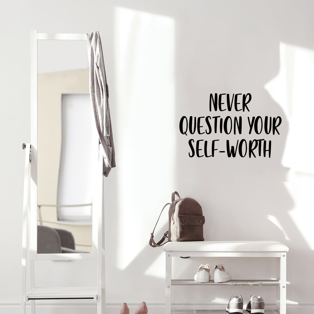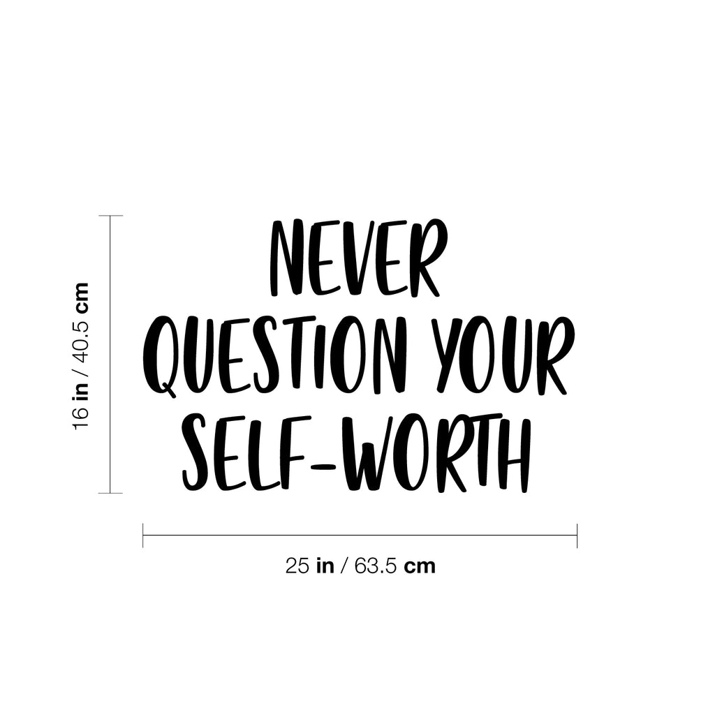 This great decal quote "Never Question Your Self-Worth"; is the perfect touch for your home. Use it for your makeup area; dorm room or anywhere you want to bring some extra decoration. It's a vinyl sticker that is easy to put on any smooth and dry surface. Our modern designs don't just brighten up the room; but brighten up the day. Using top of the line vinyl across all of our production allows us to be the leaders in quality and design.