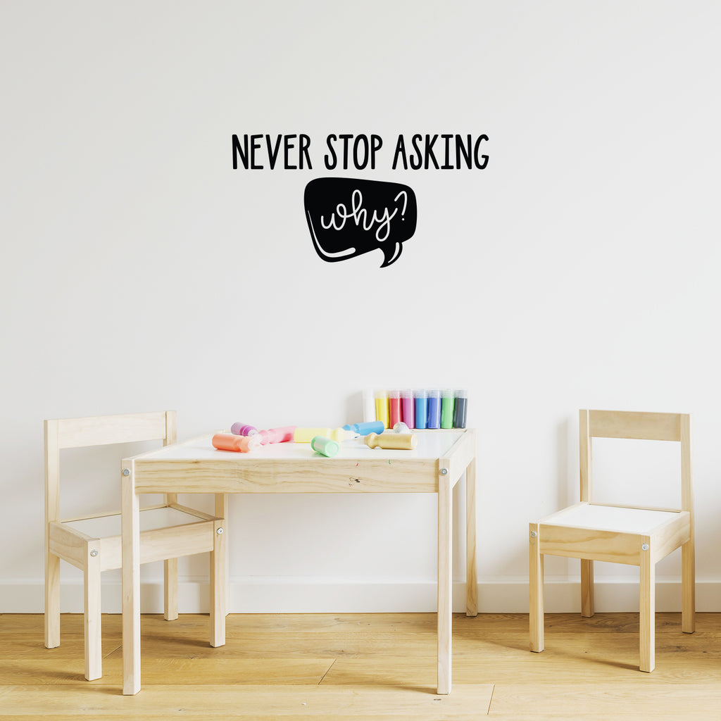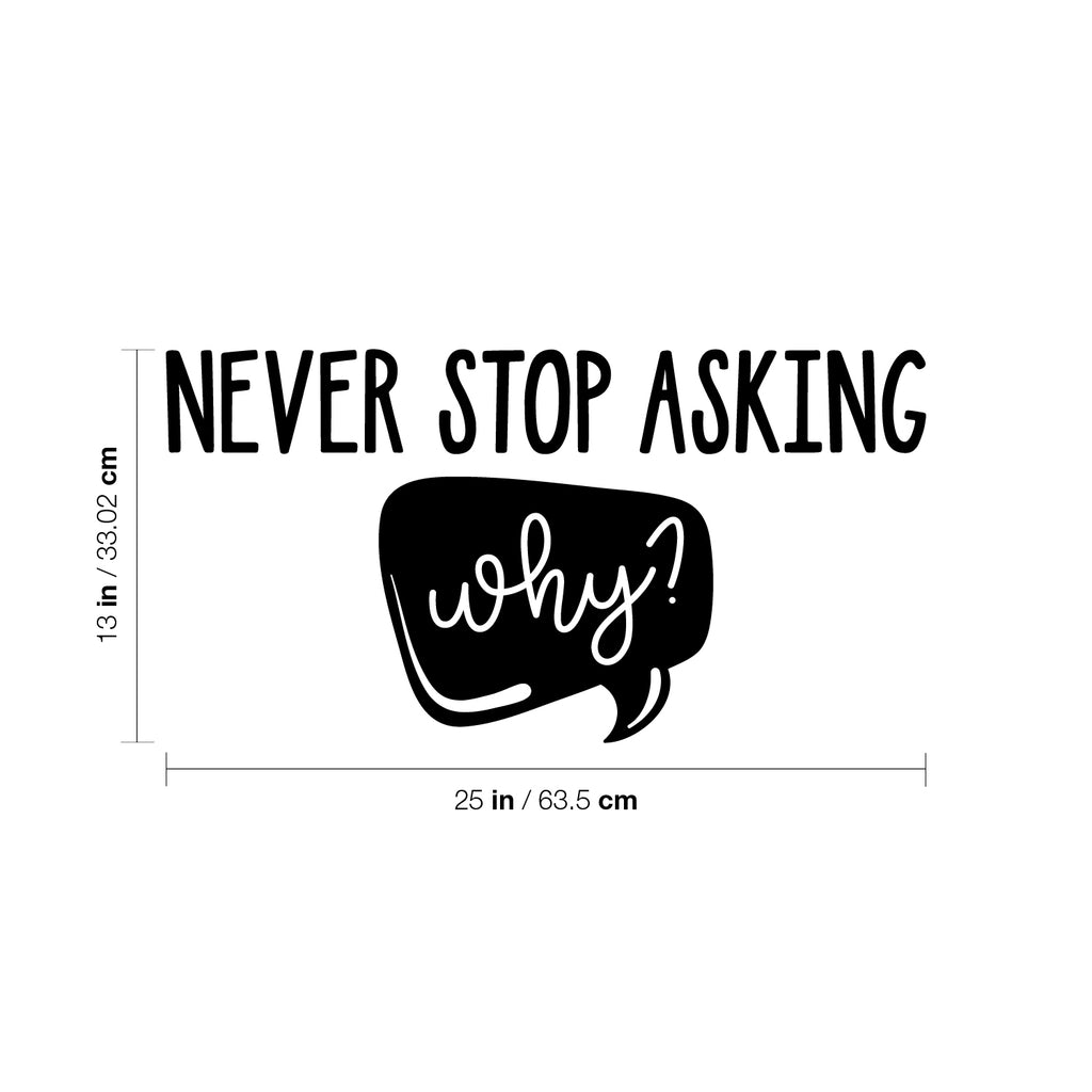This awesome inspirational decal quote "Never Stop Asking Why"; is the perfect touch for your home or classroom. Use it for your home school; living room; office or anywhere you want to bring some extra decoration. It's a vinyl sticker that is easy to put on any smooth and dry surface. Our modern designs don't just brighten up the room; but brighten up the day. Using top of the line vinyl across all of our production allows us to be the leaders in quality and design.