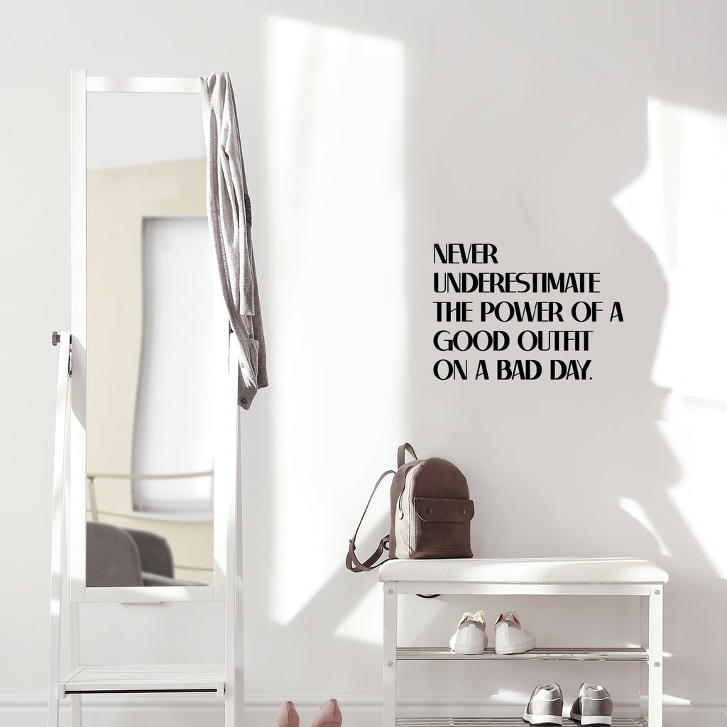 This decal quote "Never Underestimate The Power Of A Good Outfit On A Bad Day"; is the perfect touch for your home. Use it for your living room; office or anywhere you want to bring some extra cute decoration. It's a vinyl sticker that is easy to put on any smooth and dry surface. Our modern designs don't just brighten up the room; but brighten up the day. Using top of the line vinyl across all of our production allows us to be the leaders in quality and design.