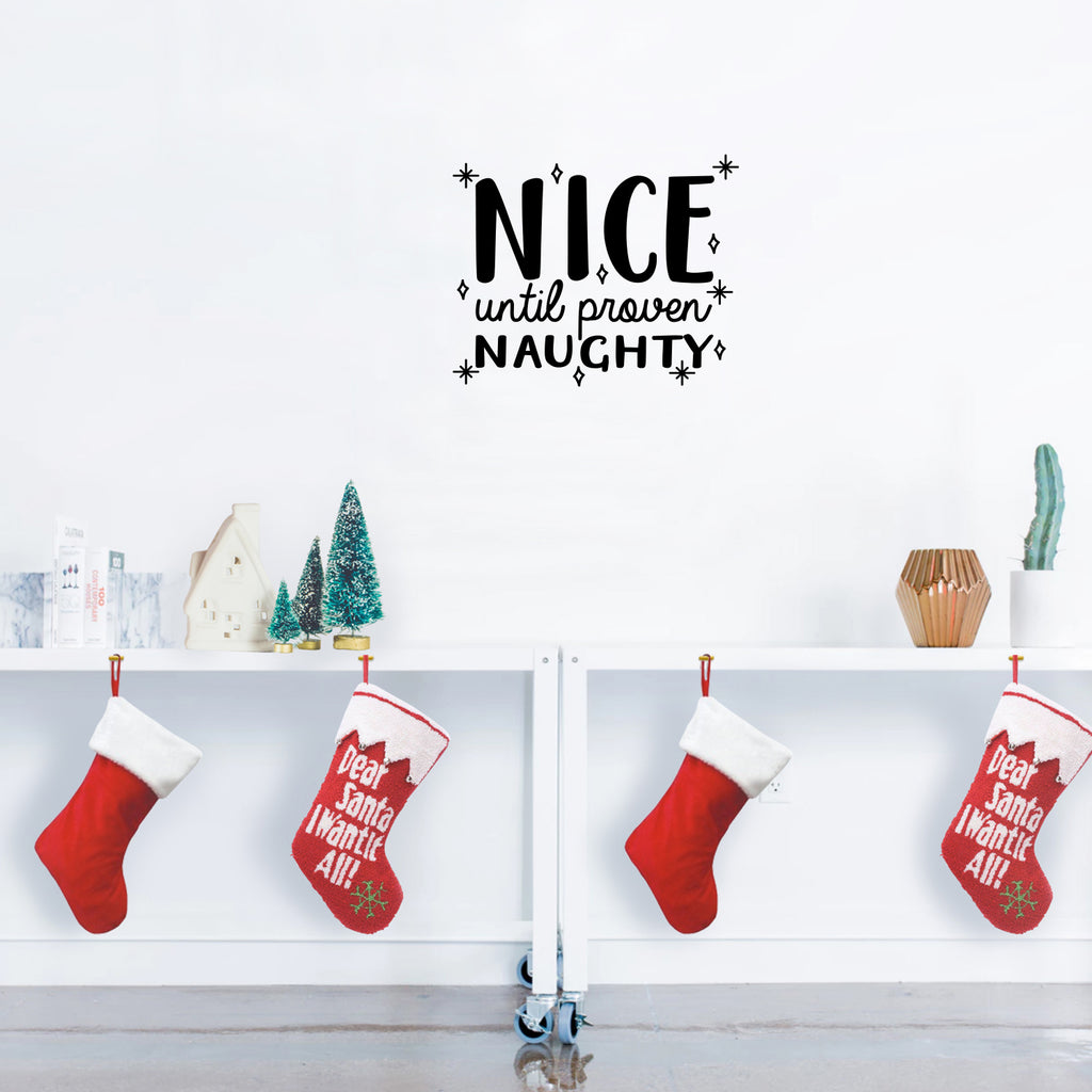 This awesome christmas decal quote "Nice Until Proven Naughty" is the perfect touch for your home or store. Use it for your living room; front door; near your christmas tree or anywhere you want to bring some extra decoration. It's a vinyl sticker that is easy to put on any smooth and dry surface. Our modern designs don't just brighten up the room; but brighten up the day. Using top of the line vinyl across all of our production allows us to be the leaders in quality and design.