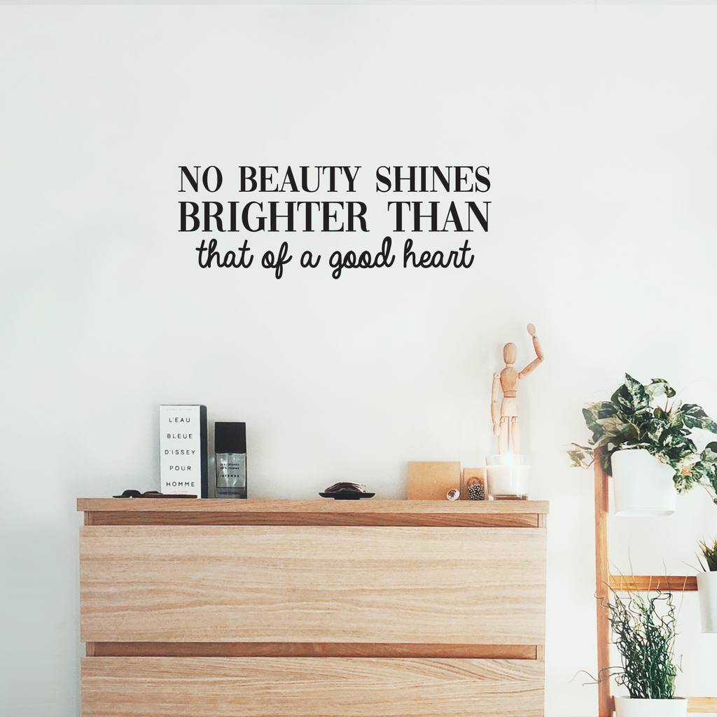 This awesome inspirational decal quote "No Beauty Shines Brighter Than That of A Good Heart"; is the perfect touch for your home or office. Use it for your bedroom; kids room; living room or anywhere you want to bring some extra positive decoration. It's a vinyl sticker that is easy to put on any smooth and dry surface. Our modern designs don't just brighten up the room; but brighten up the day. Using top of the line vinyl across all of our production allows us to be the leaders in quality and design.