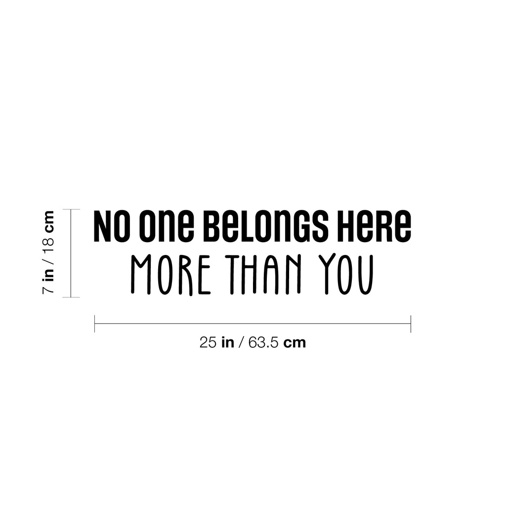 This awesome motivational decal quote "No One Belongs Here More Than You"; is the perfect touch for your home or office. Use it for your bedroom; closet; living room or anywhere you want to bring some extra positive decoration. It's a vinyl sticker that is easy to put on any smooth and dry surface. Our modern designs don't just brighten up the room; but brighten up the day. Using top of the line vinyl across all of our production allows us to be the leaders in quality and design.