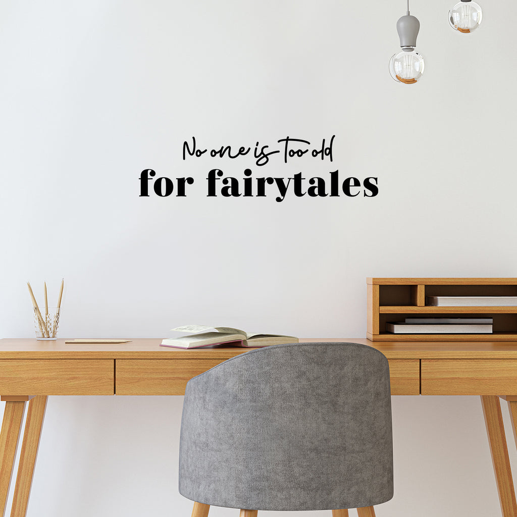 This awesome cute decal quote "No One Is Too Old For Fairytales"; is the perfect touch for your home. Use it for your living room; playroom; kids room or anywhere you want to bring some extra cute decoration. It's a vinyl sticker that is easy to put on any smooth and dry surface. Our modern designs don't just brighten up the room; but brighten up the day. Using top of the line vinyl across all of our production allows us to be the leaders in quality and design.