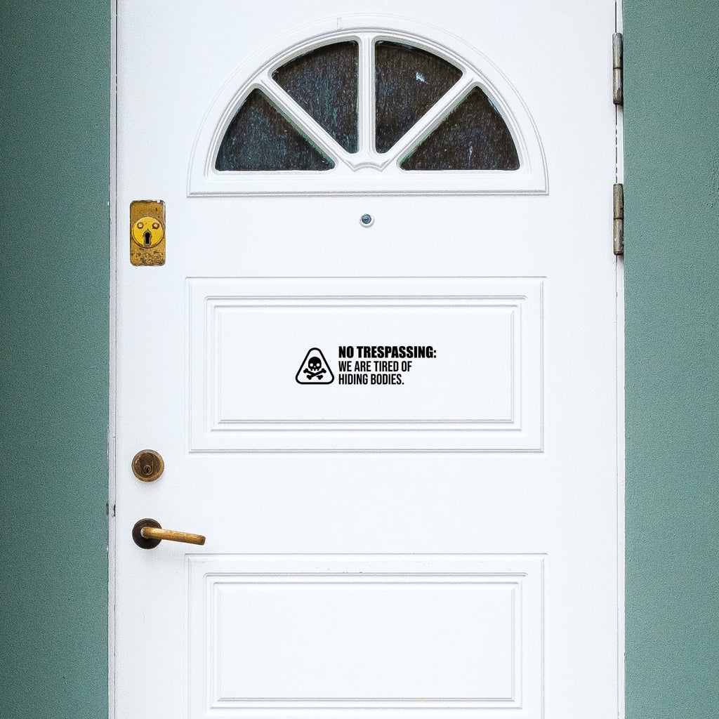 This funny decal quote "No Trespassing We Are Tired Of Hiding Bodies"; is the perfect touch for your home or office. Use it for your office or anywhere you want to bring some extra funny decoration. It's a vinyl sticker that is easy to put on any smooth and dry surface. Our modern designs don't just brighten up the room; but brighten up the day. Using top of the line vinyl across all of our production allows us to be the leaders in quality and design.