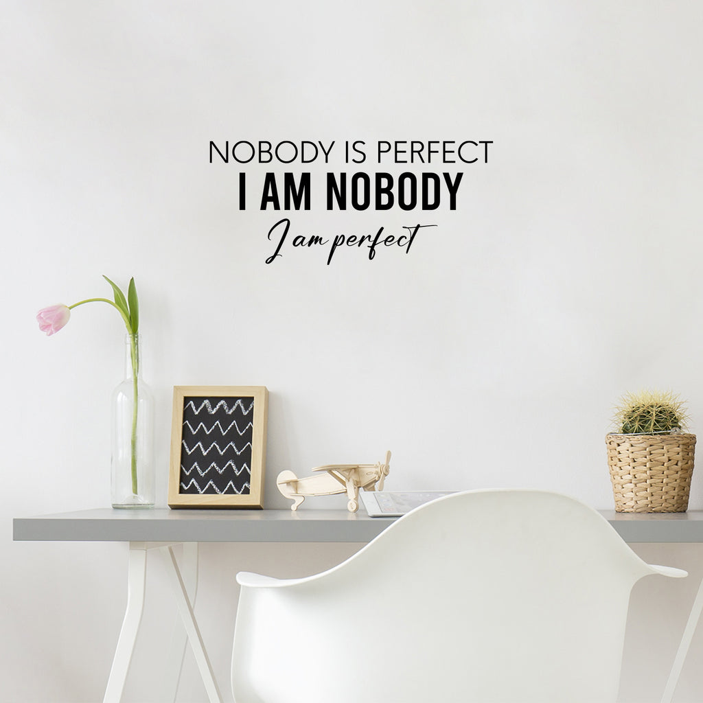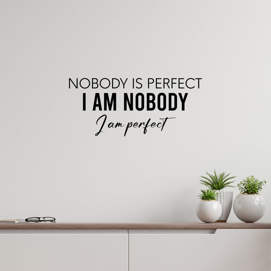 This awesome inspiring decal quote "Nobody Is Perfect I Am Nobody I Am Perfect"; is the perfect touch for your home or office. Use it for your playroom; kids room; classroom or anywhere you want to bring some extra positive decoration. It's a vinyl sticker that is easy to put on any smooth and dry surface. Our modern designs don't just brighten up the room; but brighten up the day. Using top of the line vinyl across all of our production allows us to be the leaders in quality and design.