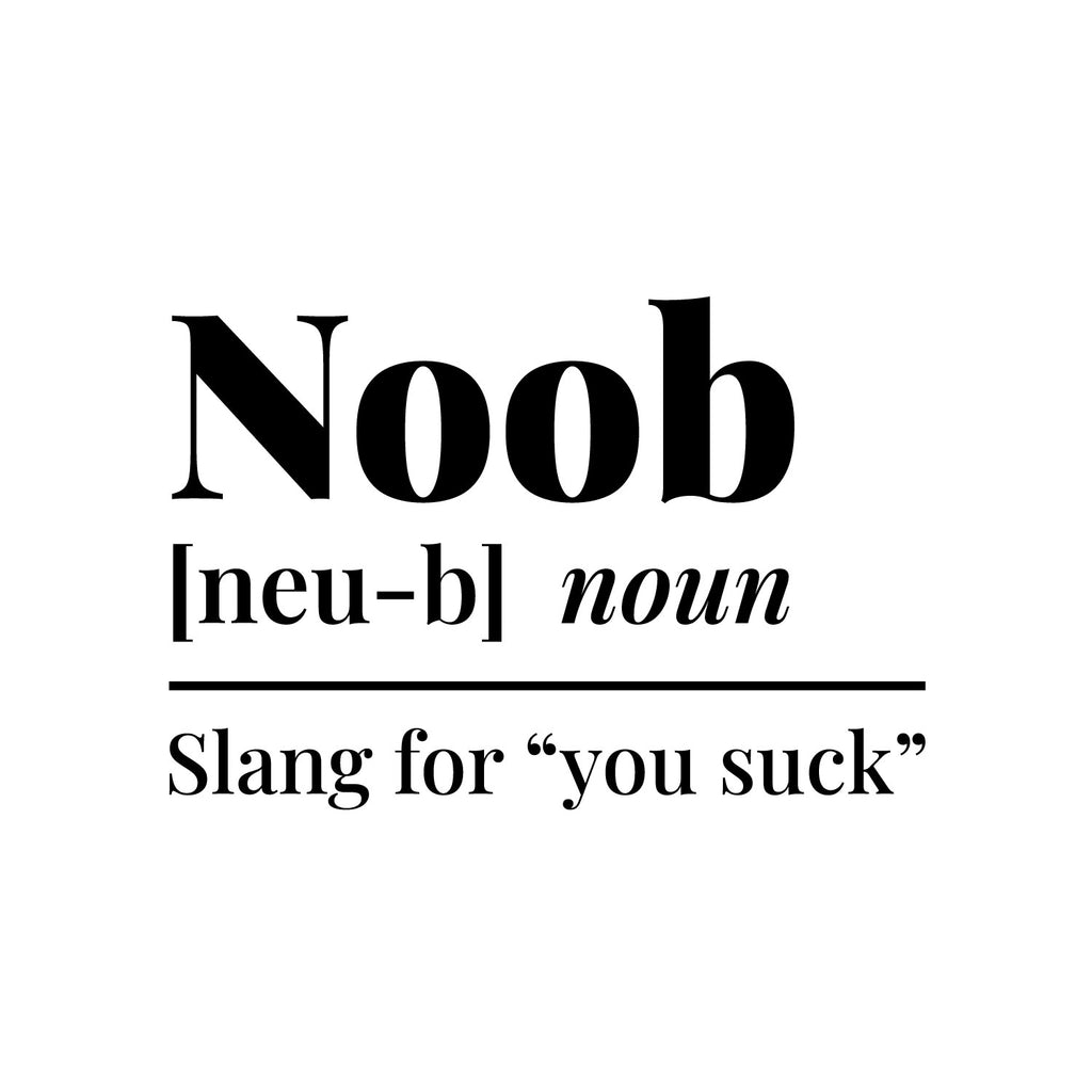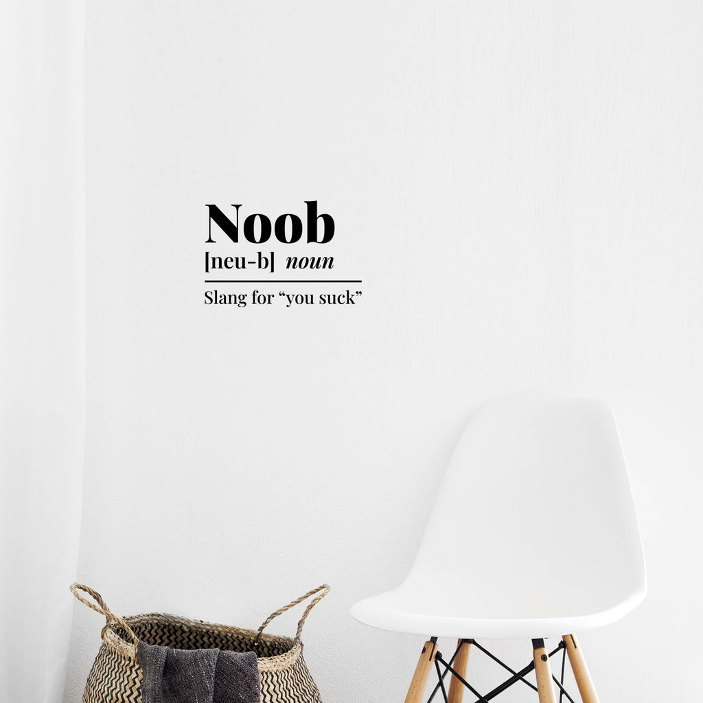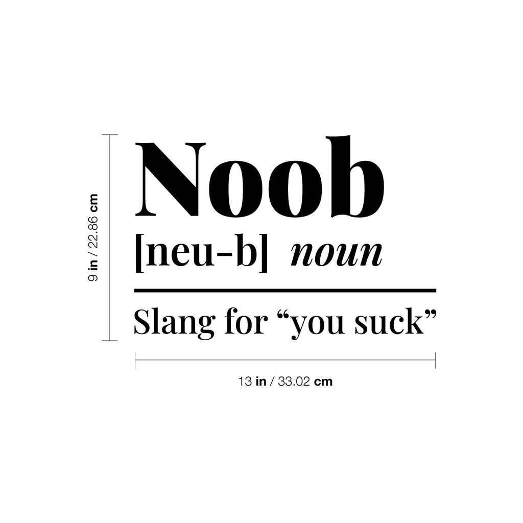 This awesome funny decal quote "Noob. Slang For "You Suck"; is the perfect touch for your home or office. Use it for your storefront; coffee shop or anywhere you want to bring some extra funny decoration. It's a vinyl sticker that is easy to put on any smooth and dry surface. Our modern designs don't just brighten up the room; but brighten up the day. Using top of the line vinyl across all of our production allows us to be the leaders in quality and design.