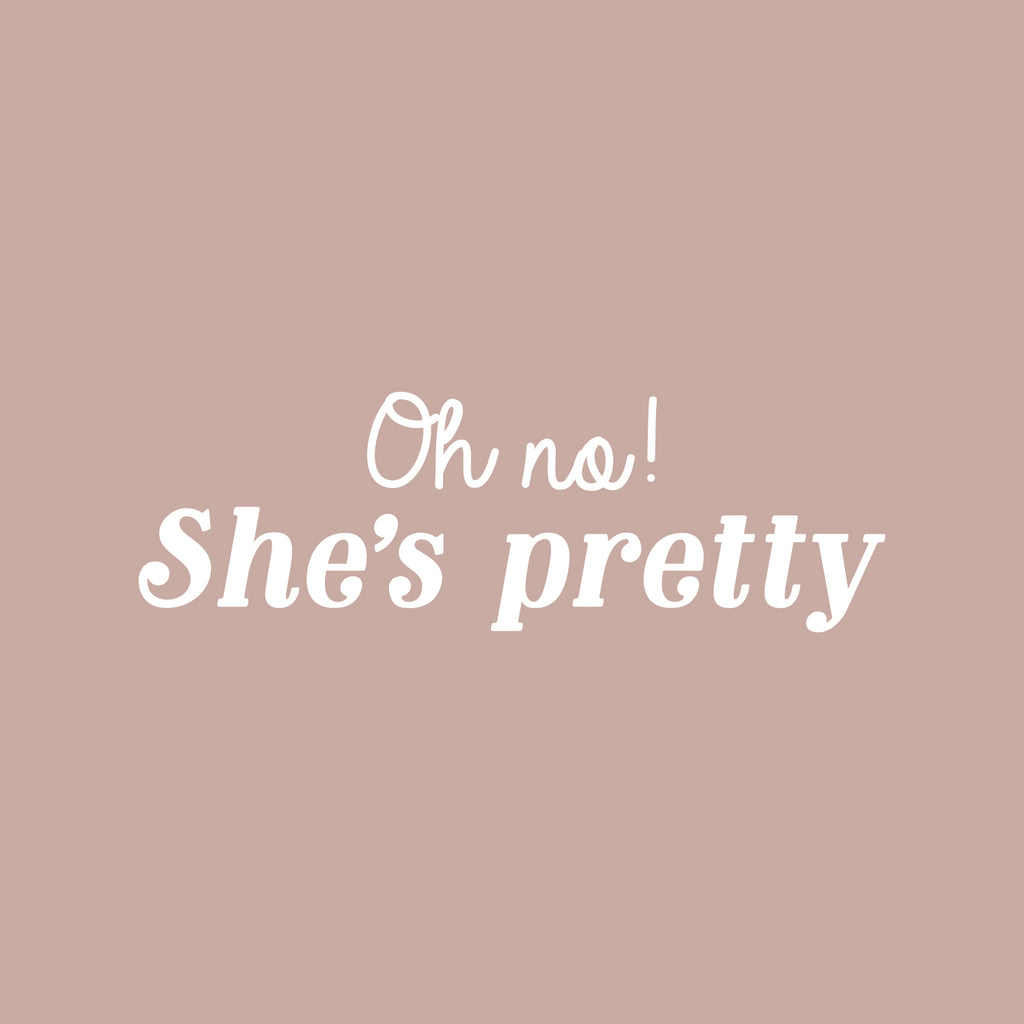 This awesome decal quote "Oh No She's Pretty"; is the perfect touch for your home or work. Use it for your dorm room; home office or anywhere you want to bring some extra decoration. It's a vinyl sticker that is easy to put on any smooth and dry surface. Our modern designs don't just brighten up the room; but brighten up the day. Using top of the line vinyl across all of our production allows us to be the leaders in quality and design.