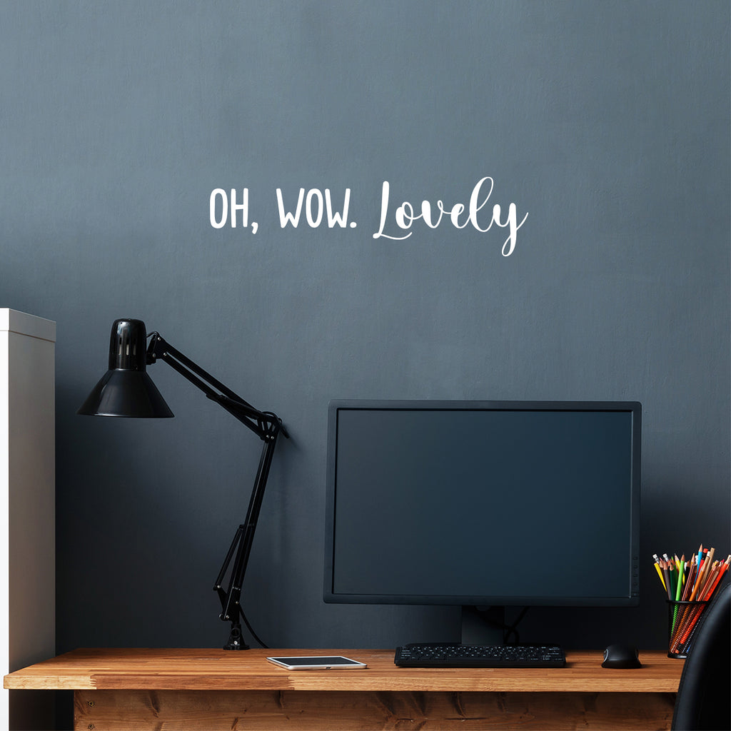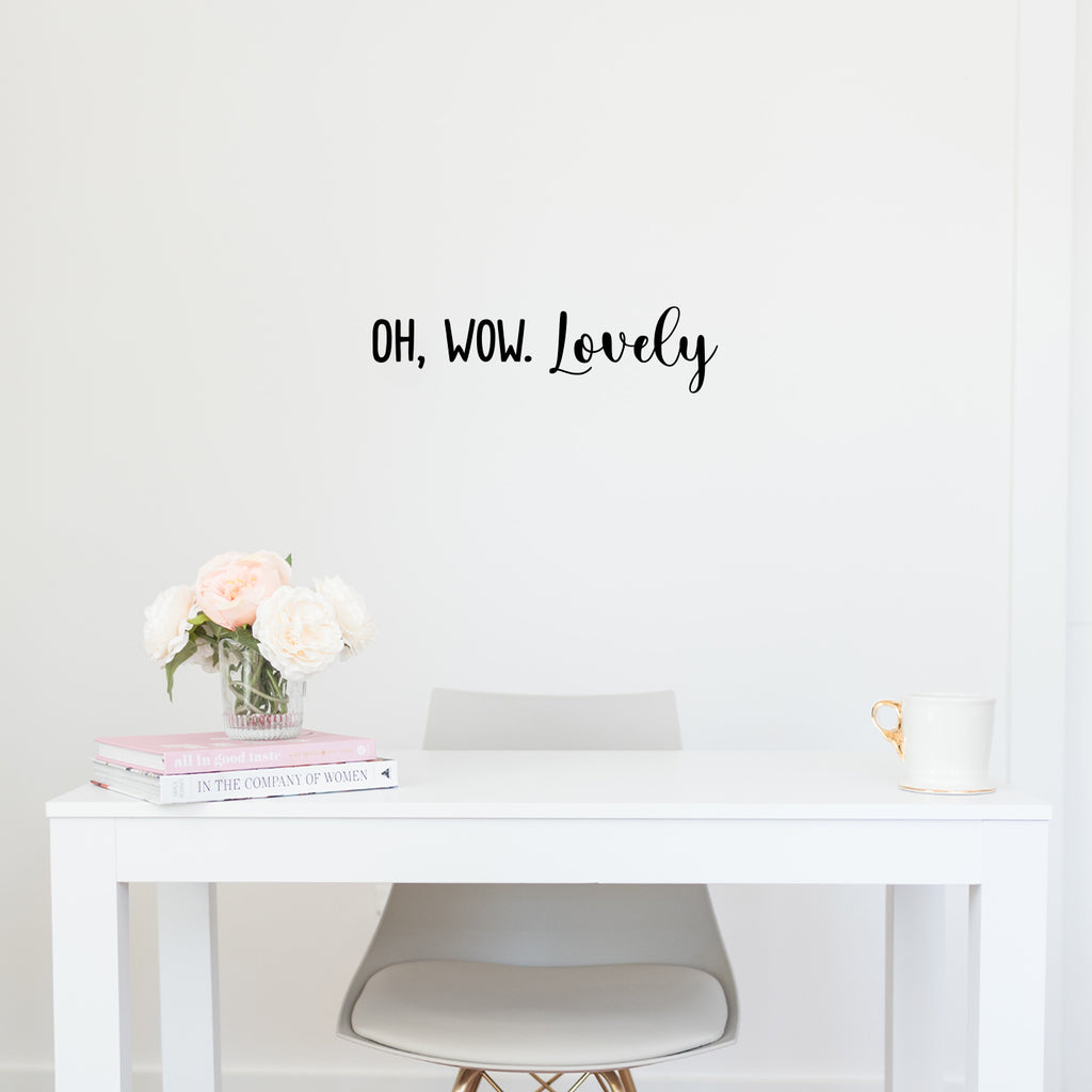 This awesome cute decal quote "Oh; Wow. Lovely"; is the perfect touch for your home or school. Use it for your living room; playroom; kids room or anywhere you want to bring some extra cute decoration. It's a vinyl sticker that is easy to put on any smooth and dry surface. Our modern designs don't just brighten up the room; but brighten up the day. Using top of the line vinyl across all of our production allows us to be the leaders in quality and design.