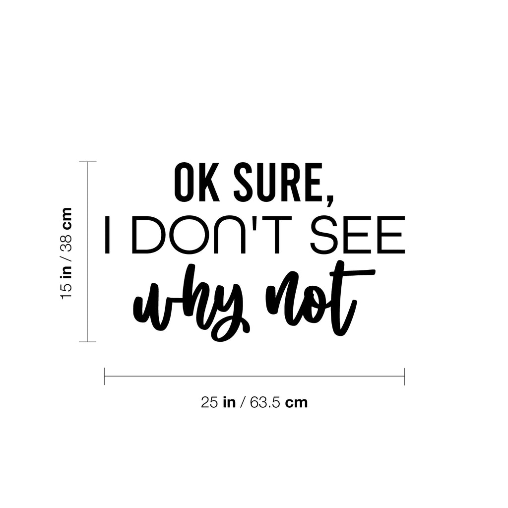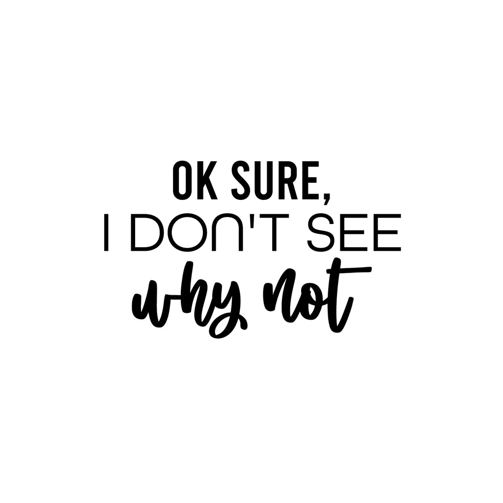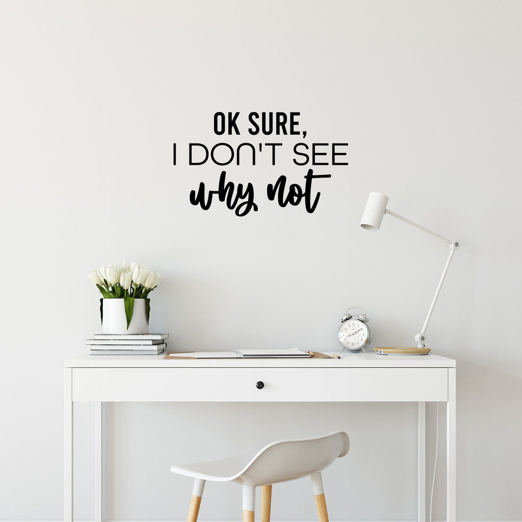 This awesome funny & sarcastic decal quote "Ok Sure; I Don't See Why Not"; is the perfect touch for your home or office. Use it for your store; coffee shop or anywhere you want to bring some extra fun decoration. It's a vinyl sticker that is easy to put on any smooth and dry surface. Our modern designs don't just brighten up the room; but brighten up the day. Using top of the line vinyl across all of our production allows us to be the leaders in quality and design.