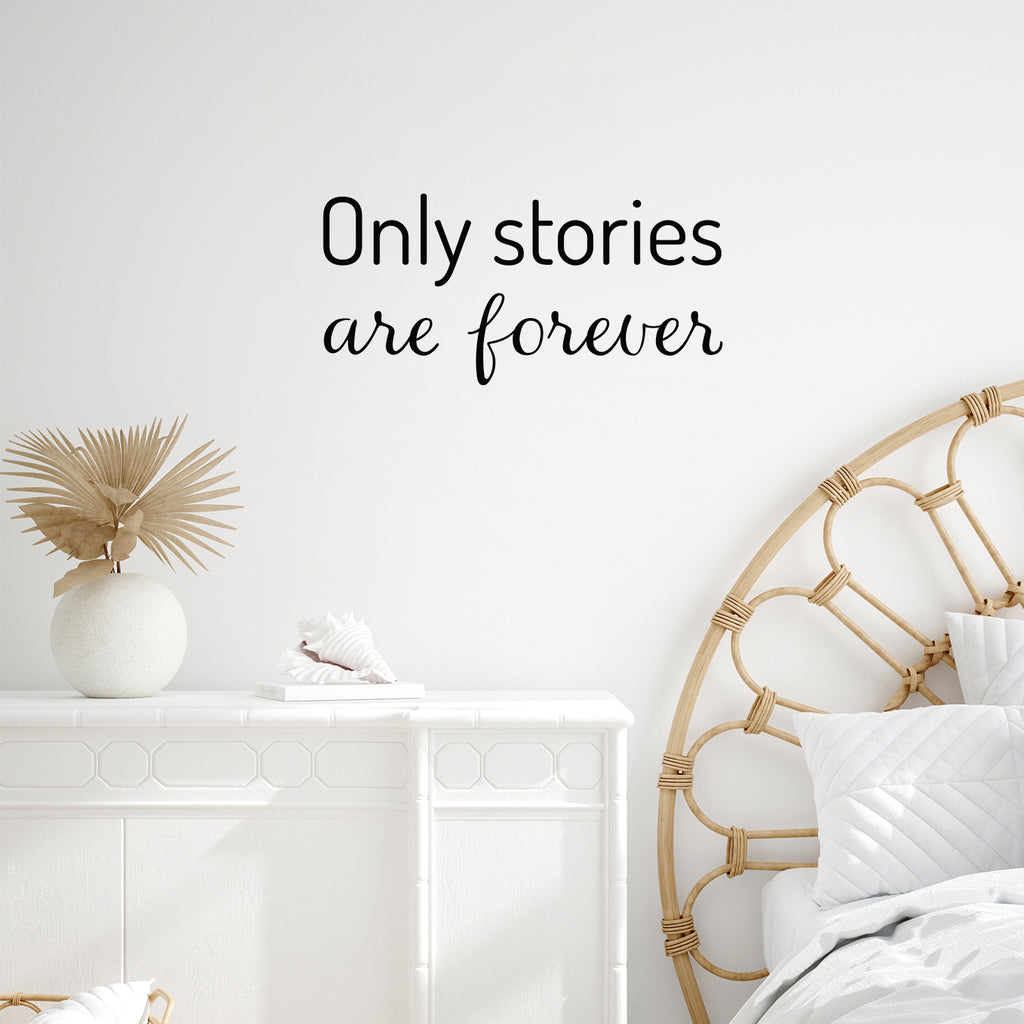 This awesome motivational decal quote "Only Stories Are Forever"; is the perfect touch for your home or school. Use it for your living room; playroom; kids room or anywhere you want to bring some extra cute decoration. It's a vinyl sticker that is easy to put on any smooth and dry surface. Our modern designs don't just brighten up the room; but brighten up the day. Using top of the line vinyl across all of our production allows us to be the leaders in quality and design.