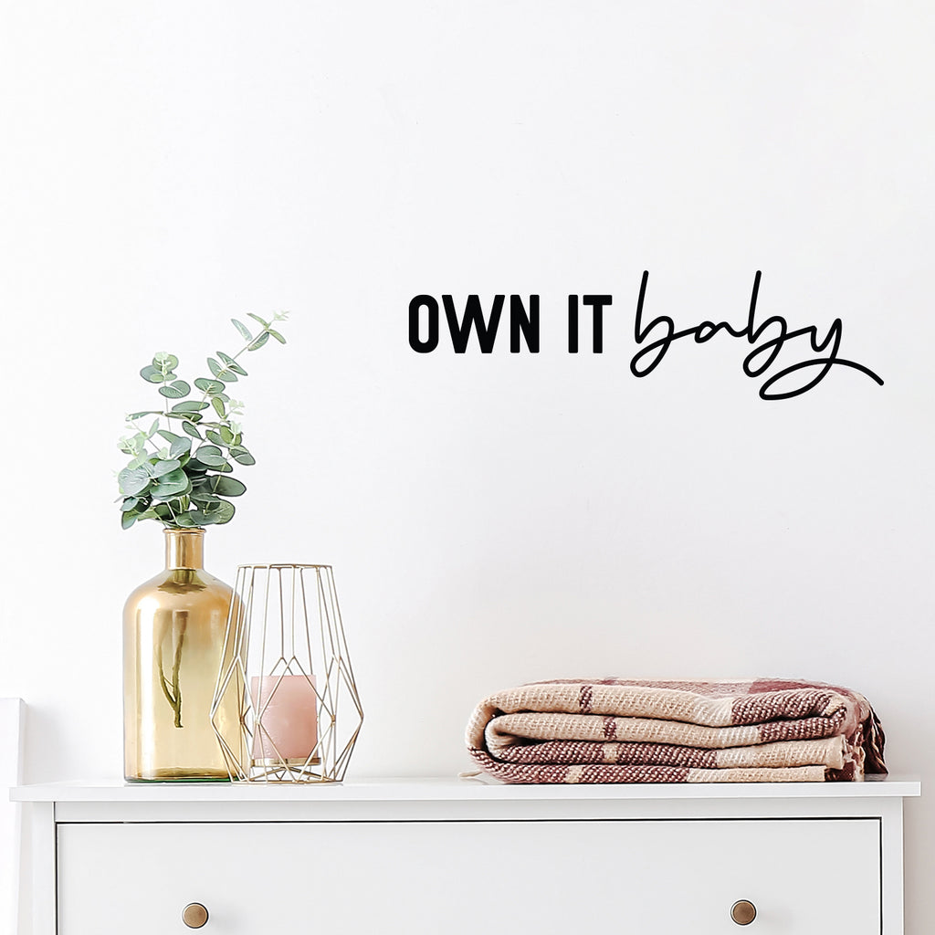 This awesome decal quote "Own It Baby"; is the perfect touch for your home or work. Use it for your dorm room; home office or anywhere you want to bring some extra decoration. It's a vinyl sticker that is easy to put on any smooth and dry surface. Our modern designs don't just brighten up the room; but brighten up the day. Using top of the line vinyl across all of our production allows us to be the leaders in quality and design.