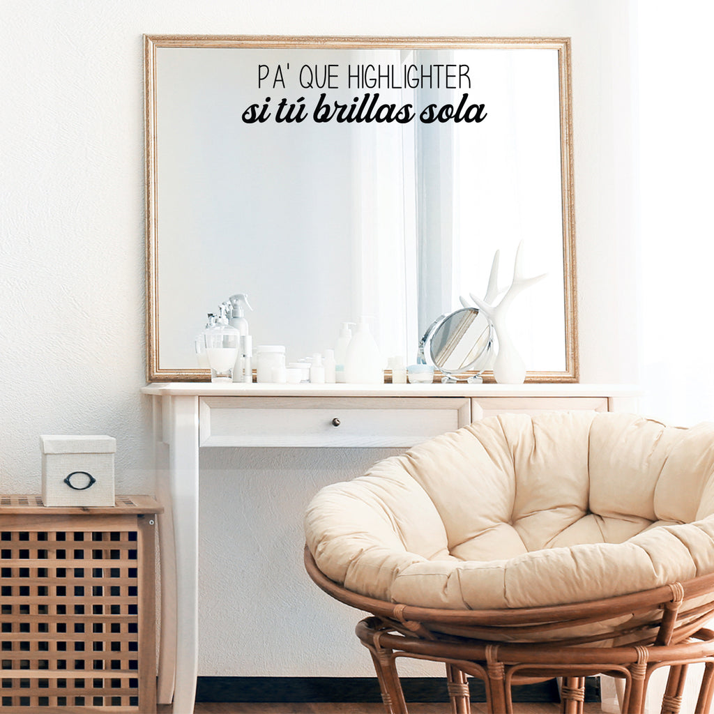 This awesome motivational & optimistic decal quote "Pa' Que Highlighter Si Tu Brillas Sola"; is the perfect touch for your home or office. Use it for your living room; office; coffee shop or anywhere you want to bring some extra cute decoration. It's a vinyl sticker that is easy to put on any smooth and dry surface. Our modern designs don't just brighten up the room; but brighten up the day. Using top of the line vinyl across all of our production allows us to be the leaders in quality and design.