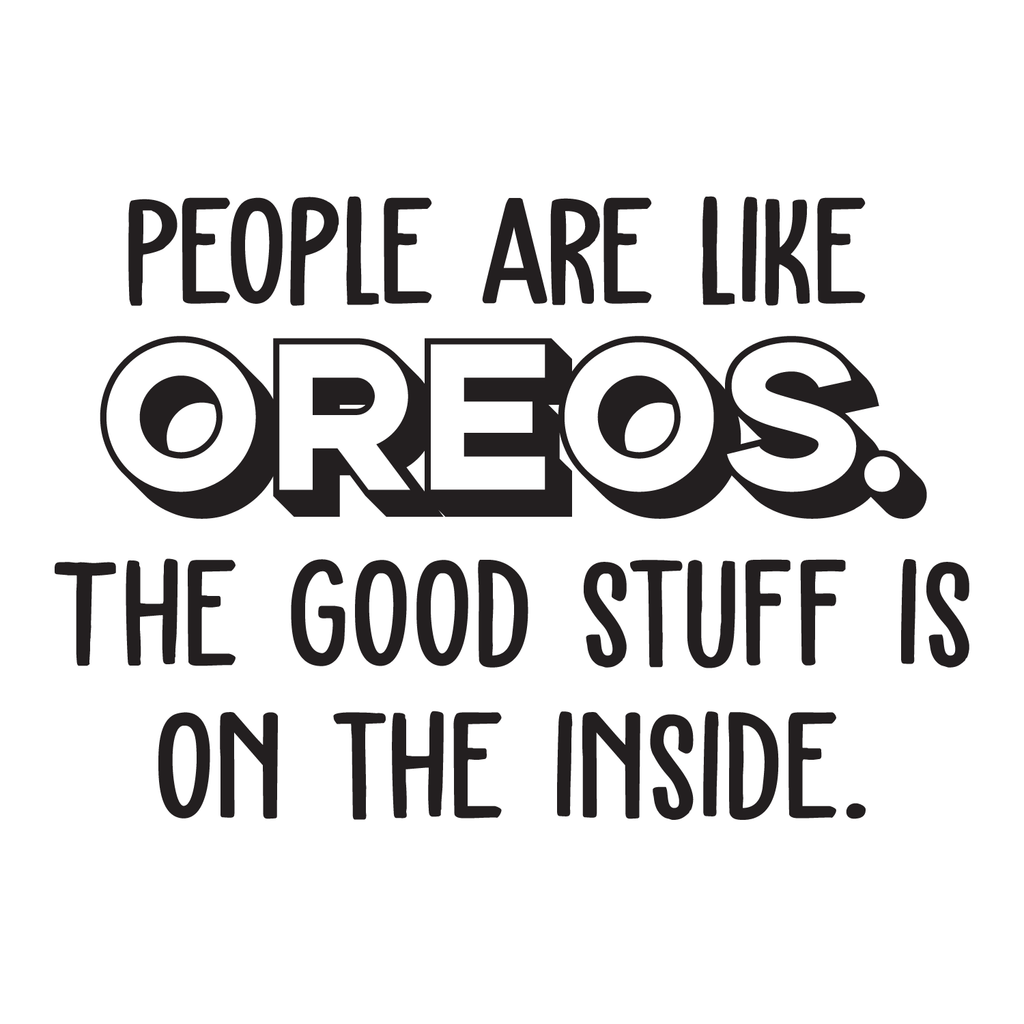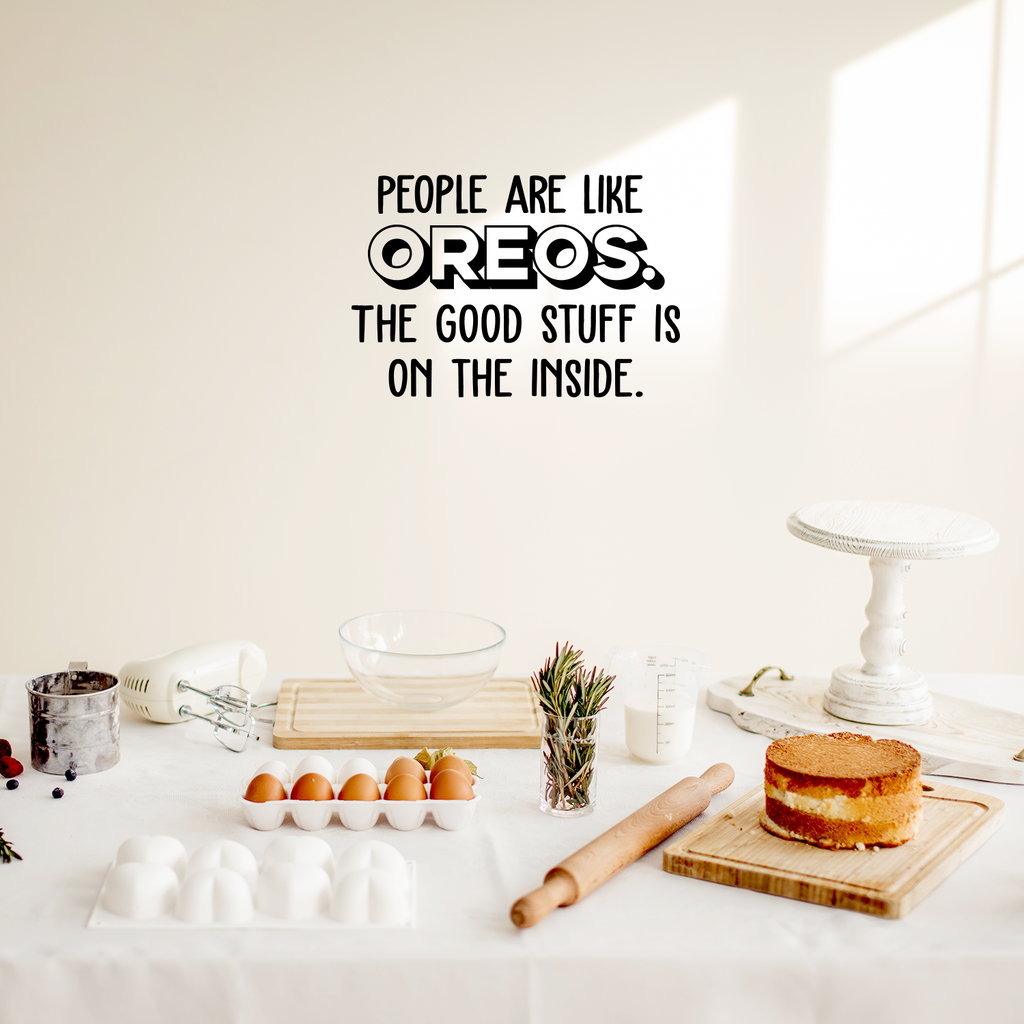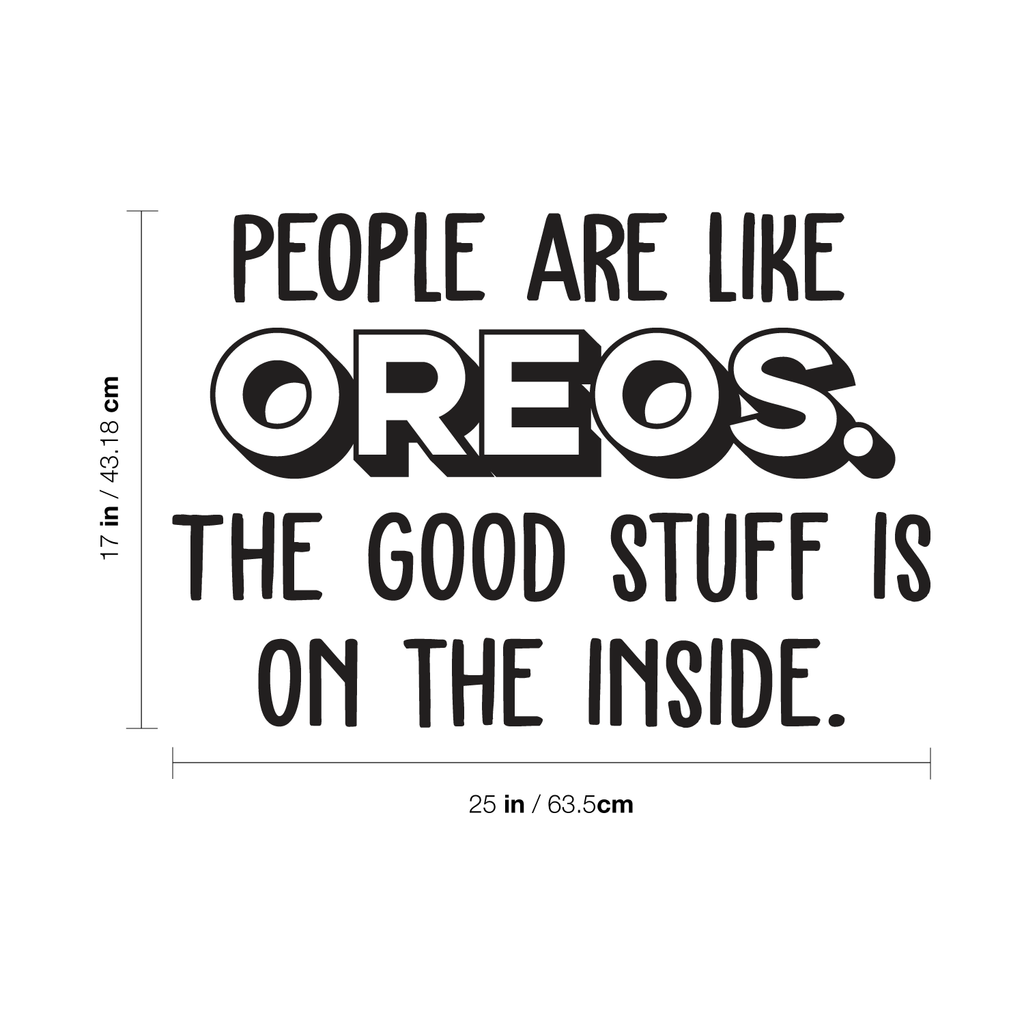 This inspirational funny decal quote "People Are Like Oreos The Good Stuff Is On The Inside"; is the perfect touch for your home or coffee shop. Use it for your kitchen; dining room; office or anywhere you want to bring some extra decoration. It's a vinyl sticker that is easy to put on any smooth and dry surface. Our modern designs don't just brighten up the room; but brighten up the day. Using top of the line vinyl across all of our production allows us to be the leaders in quality and design.