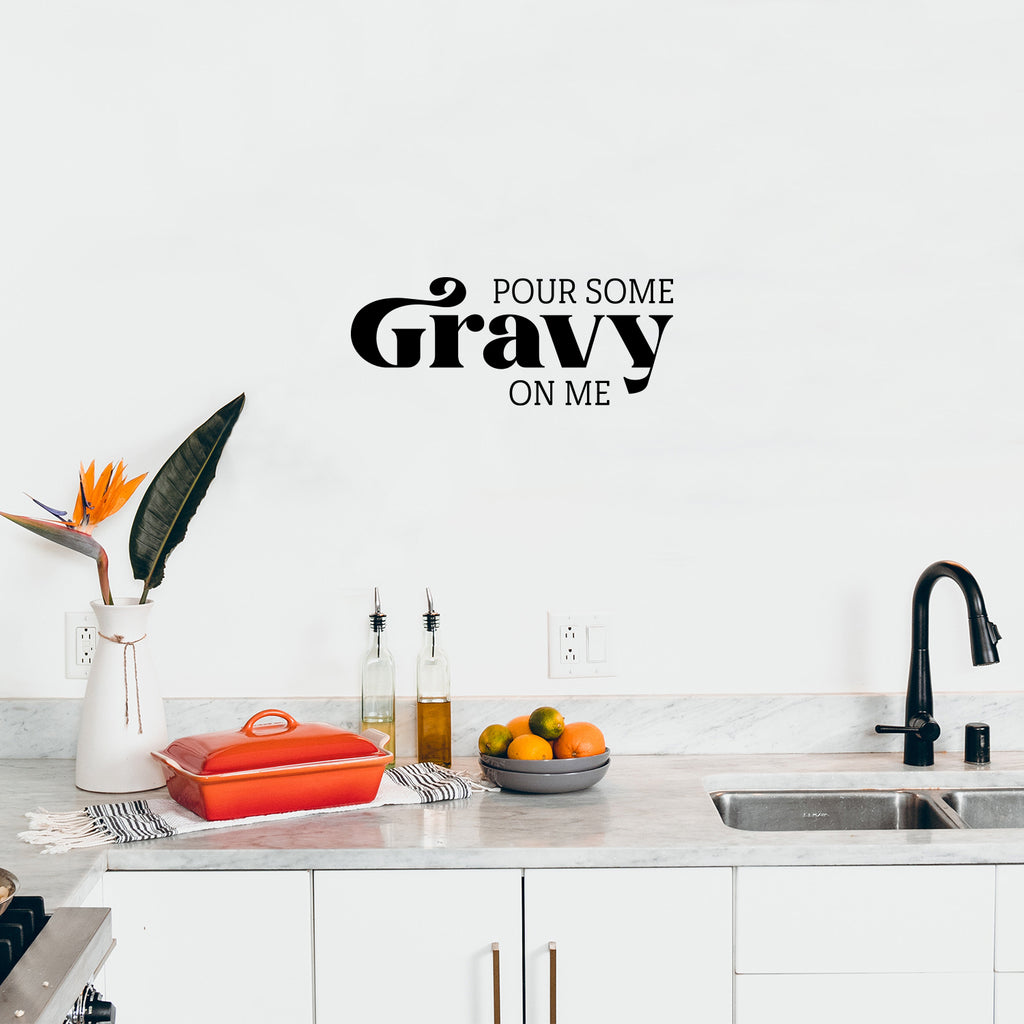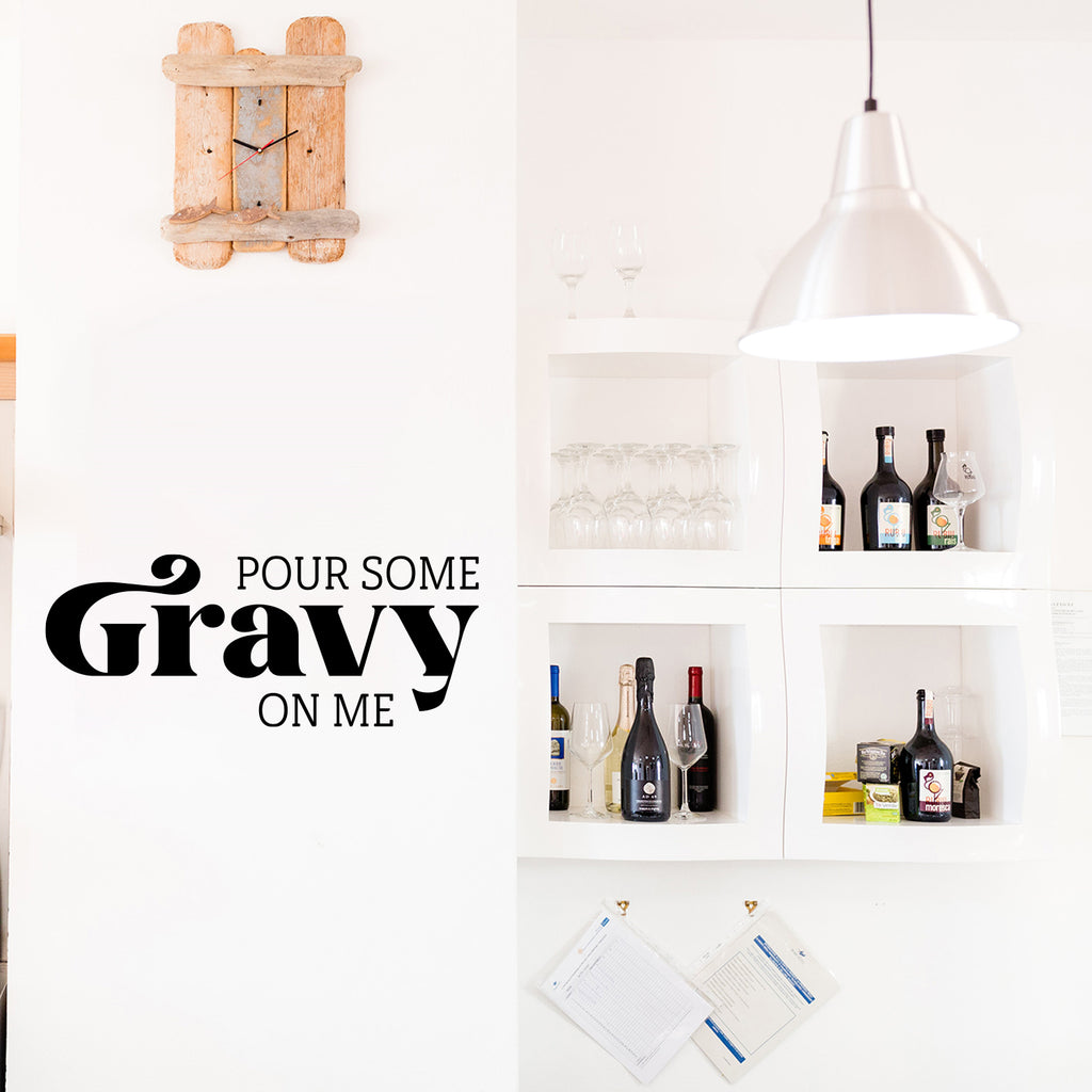 This awesome lovely autumn season decal "Pour Some Gravy On Me"; is the perfect touch for your home. Use it for your kitchen; dining room; restaurant windows or anywhere you want to bring some extra fun decoration. It's a vinyl sticker that is easy to put on any smooth and dry surface. Our modern designs don't just brighten up the room; but brighten up the day. Using top of the line vinyl across all of our production allows us to be the leaders in quality and design.