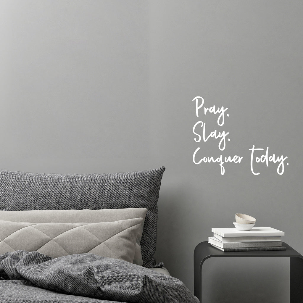This awesome spiritual & inspiring decal quote "Pray Slay Conquer Today"; is the perfect touch for your home. Use it for your bedroom; closet; living room or anywhere you want to bring some extra cute decoration. It's a vinyl sticker that is easy to put on any smooth and dry surface. Our modern designs don't just brighten up the room; but brighten up the day. Using top of the line vinyl across all of our production allows us to be the leaders in quality and design.