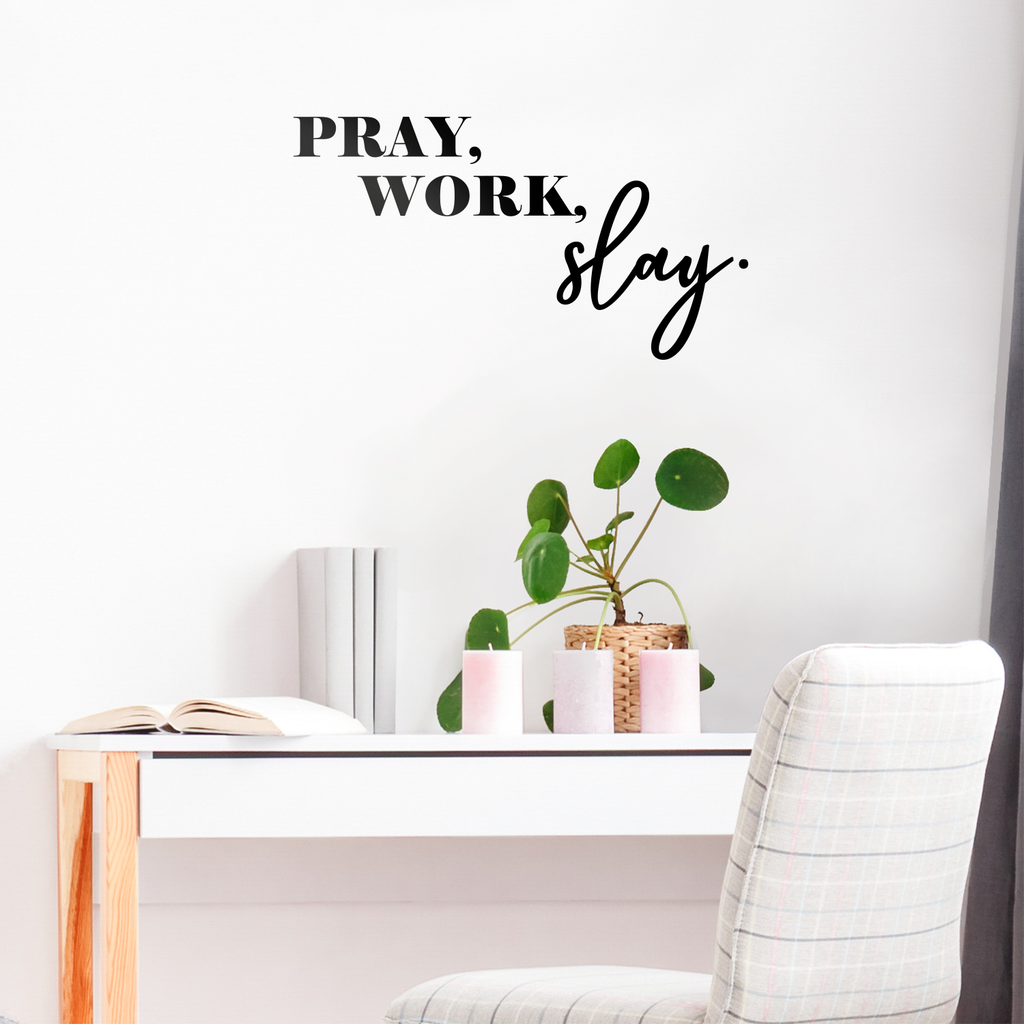 This awesome "Pray Work Slay" wall decal quote is modern and the perfect touch for your home or workplace. Use it for your bedroom; living room; or any other room in your house where you want to bring some extra decoration. It's a vinyl sticker that is easy to put on almost any smooth and dry surface. Our designs don't just brighten up the room; but brighten up your day. Using top of the line vinyl across all of our production allows us to be the leaders in quality and design.