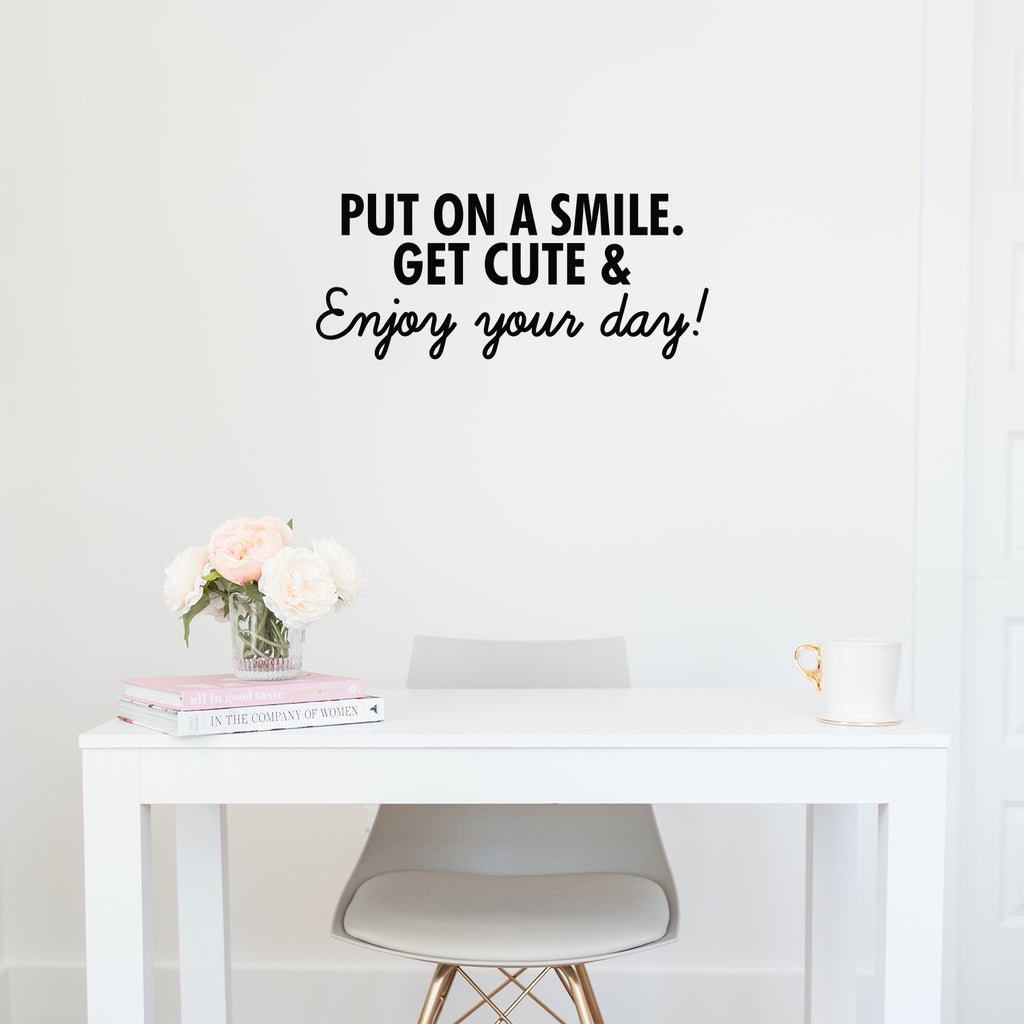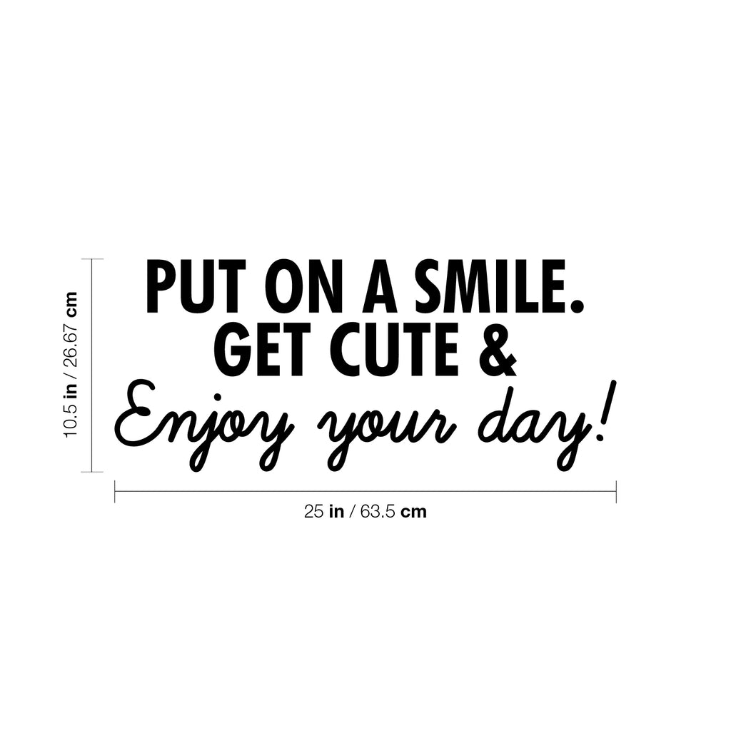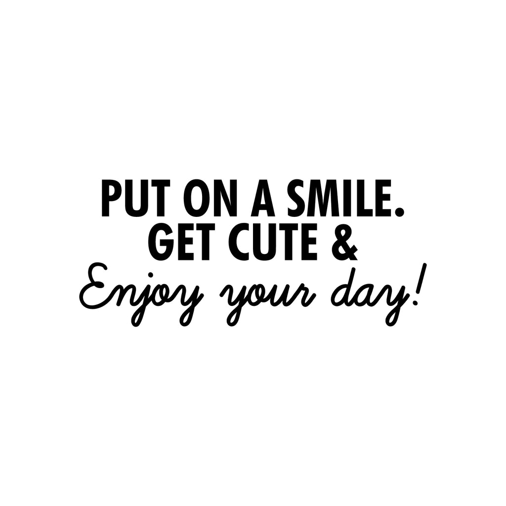 This great decal quote "Put On A Smile. Get Cute & Enjoy Your Day!"; is the perfect touch for your home. Use it for your kids room; living room or anywhere you want to bring some extra decoration. It's a vinyl sticker that is easy to put on any smooth and dry surface. Our modern designs don't just brighten up the room; but brighten up the day. Using top of the line vinyl across all of our production allows us to be the leaders in quality and design.