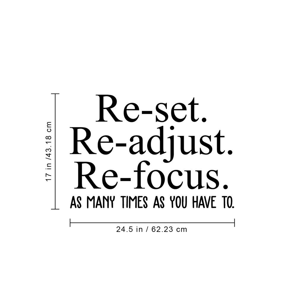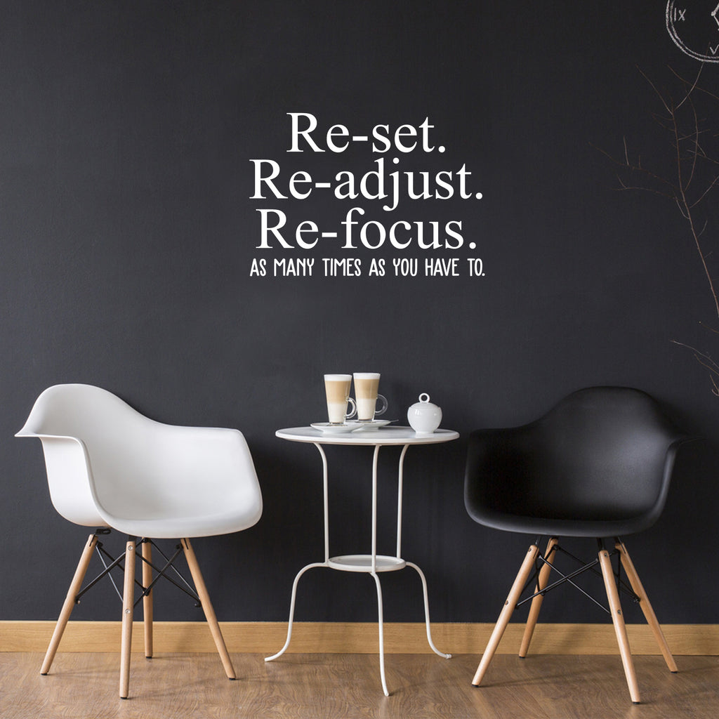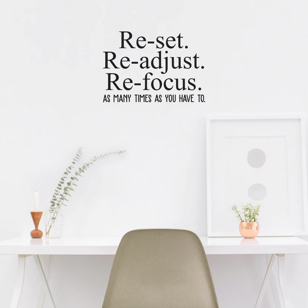 This motivational decal quote "Reset Readjust Refocus As Many Times As You Have To"; is the perfect touch for your home or office. Use it for your bedroom; closet; living room or anywhere you want to bring some extra positive decoration. It's a vinyl sticker that is easy to put on any smooth and dry surface. Our modern designs don't just brighten up the room; but brighten up the day. Using top of the line vinyl across all of our production allows us to be the leaders in quality and design.