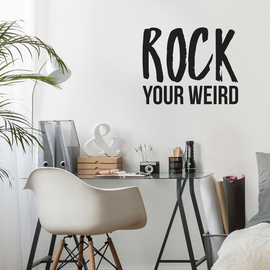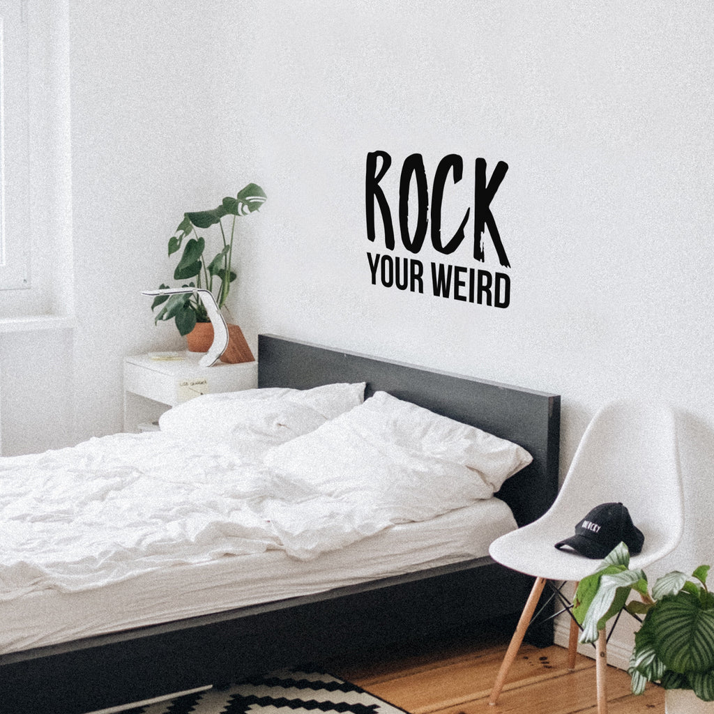This awesome decal quote "Rock Your Weird"; is the perfect touch for your home or apartment. Use it for your dorm room; living room or anywhere you want to bring some extra decoration. It's a vinyl sticker that is easy to put on any smooth and dry surface. Our modern designs don't just brighten up the room; but brighten up the day. Using top of the line vinyl across all of our production allows us to be the leaders in quality and design.