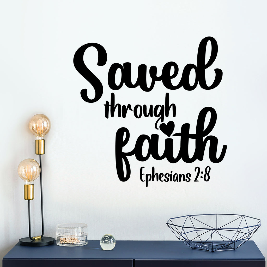 This spiritual & inspiring decal quote "Saved Through Faith - Ephesians 2:8"; is the perfect touch for your home. Use it for your office; living room or anywhere you want to bring some extra cute decoration. It's a vinyl sticker that is easy to put on any smooth and dry surface. Our modern designs don't just brighten up the room; but brighten up the day. Using top of the line vinyl across all of our production allows us to be the leaders in quality and design.