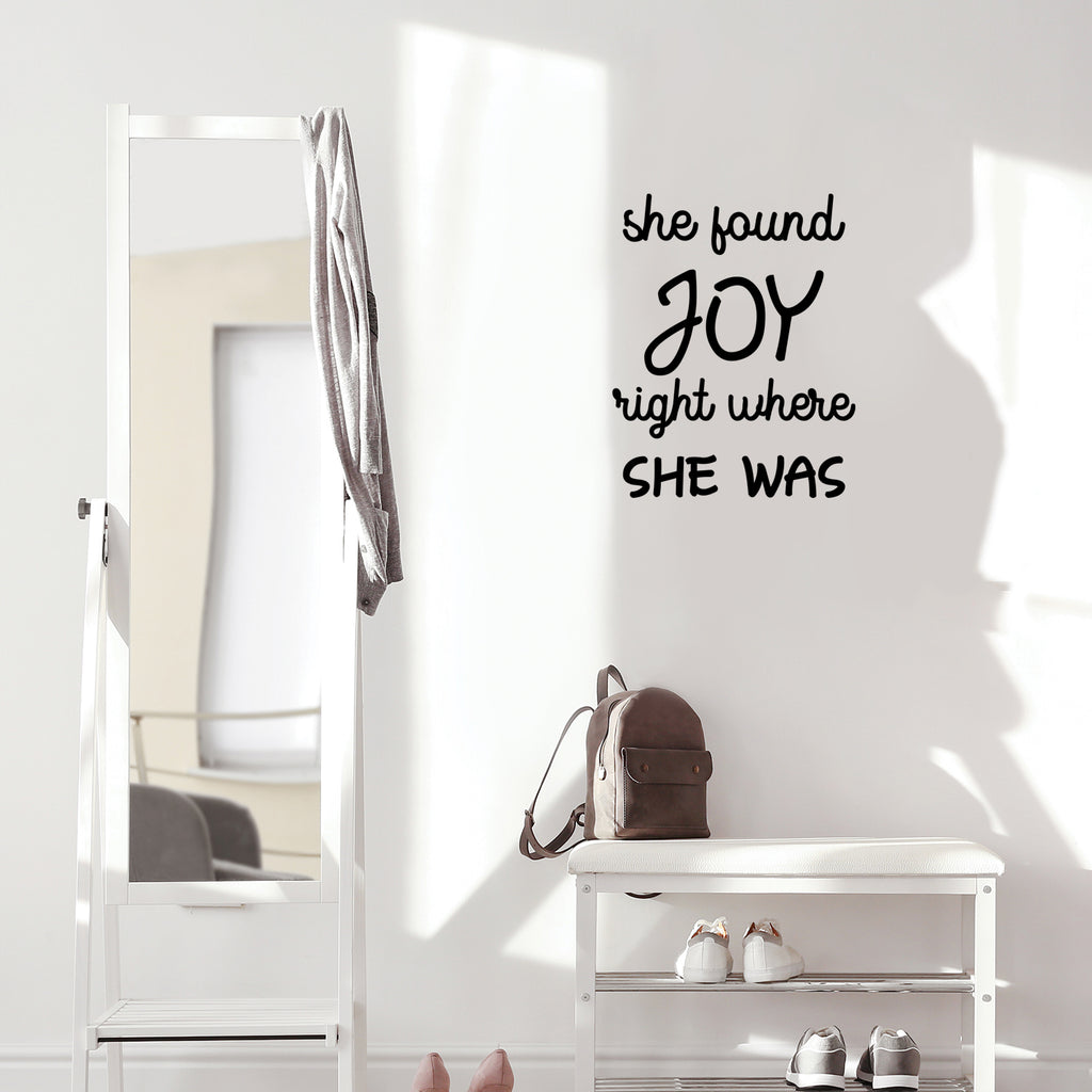 This awesome decal quote "She Found Joy Right Where She Was"; is the perfect touch for your home or work. Use it for your dorm room; home office or anywhere you want to bring some extra decoration. It's a vinyl sticker that is easy to put on any smooth and dry surface. Our modern designs don't just brighten up the room; but brighten up the day. Using top of the line vinyl across all of our production allows us to be the leaders in quality and design.