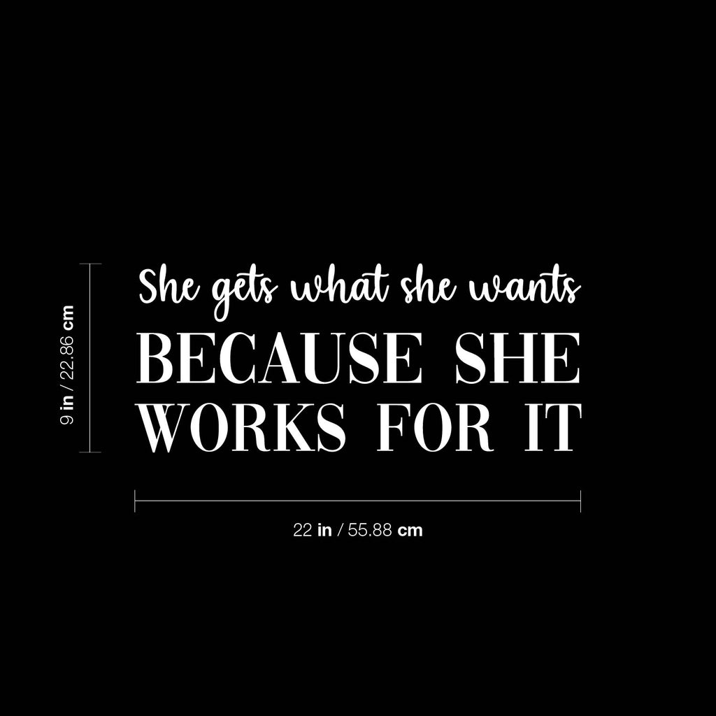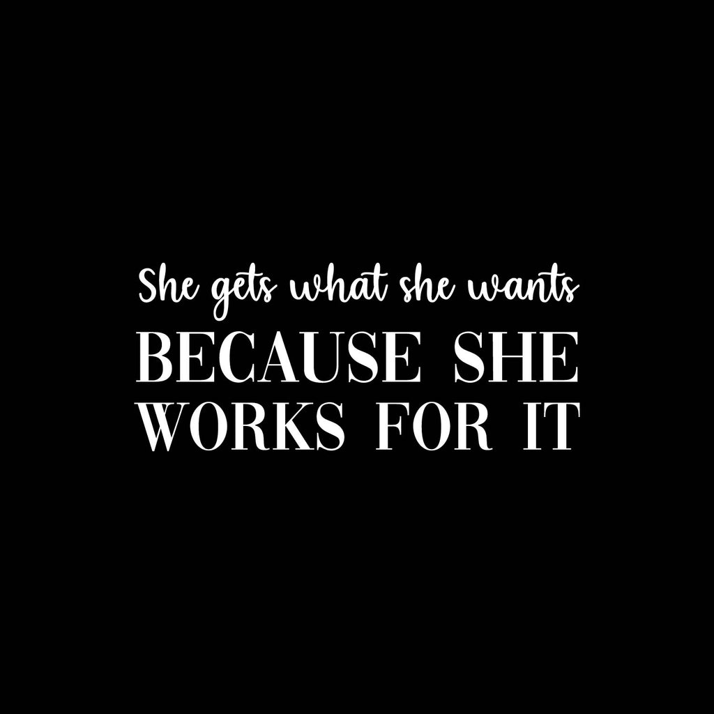 This awesome girly & optimistic decal quote "She Gets What She Wants Because She Works For It"; is the perfect touch for your home or office. Use it for your bedroom; girls room or anywhere you want to bring some extra cute decoration. It's a vinyl sticker that is easy to put on any smooth and dry surface. Our modern designs don't just brighten up the room; but brighten up the day. Using top of the line vinyl across all of our production allows us to be the leaders in quality and design.
