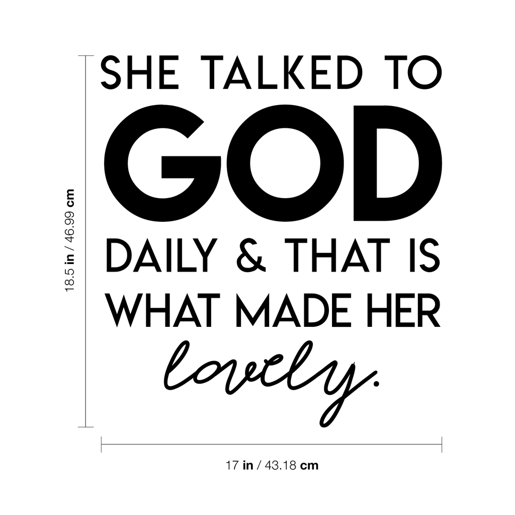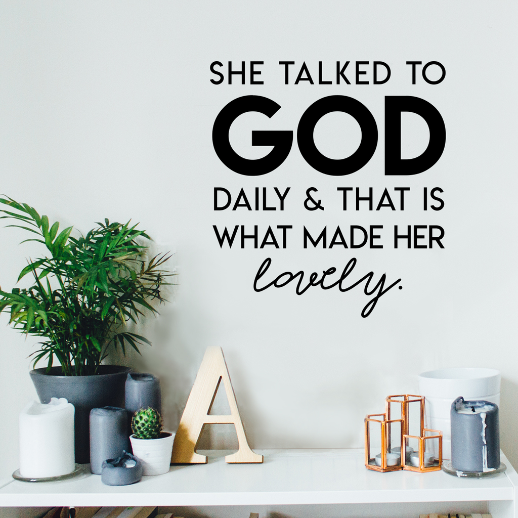 This spiritual "She Talked To God And That Is What Made Her Lovely" wall art decal is the perfect touch for your home; office; or church decor. Use it for your bedroom; living room; or anywhere you want to bring some extra decoration. It's a vinyl sticker that is easy to put on almost any smooth and dry surface. Our modern designs don't just brighten up the room; but brighten up the day. Using top of the line vinyl across all of our production allows us to be the leaders in quality and design.