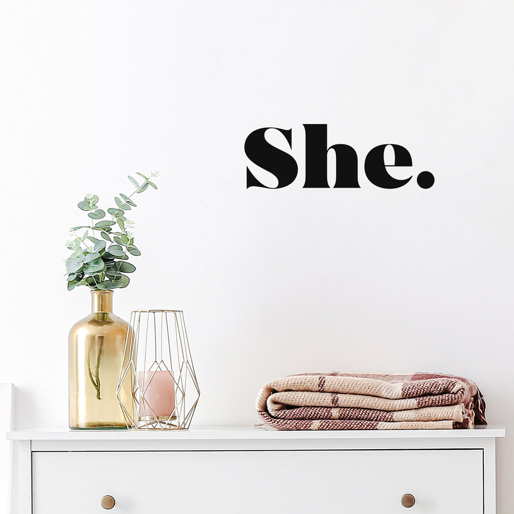 This awesome decal quote "She."; is the perfect touch for your home or work. Use it for your dorm room; home office or anywhere you want to bring some extra decoration. It's a vinyl sticker that is easy to put on any smooth and dry surface. Our modern designs don't just brighten up the room; but brighten up the day. Using top of the line vinyl across all of our production allows us to be the leaders in quality and design.