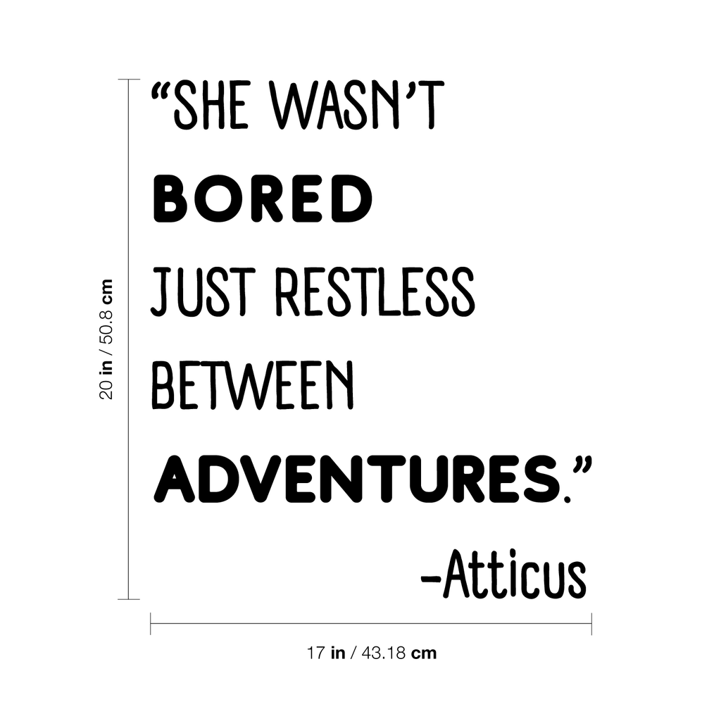 This awesome "She Wasn't Bored Just Restless Between Adventures - Atticus" wall art decal is modern and the perfect touch for your home or office. Use it for your bedroom; living room; or anywhere you want to bring some extra travel decoration. It's a vinyl sticker that is easy to put on almost any smooth and dry surface. Our modern designs don't just brighten up the room; but brighten up the day. Using top of the line vinyl across all of our production allows us to be the leaders in quality and design.