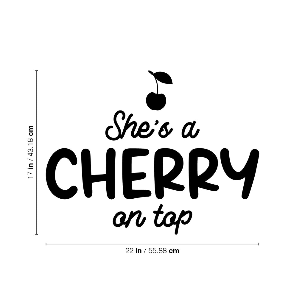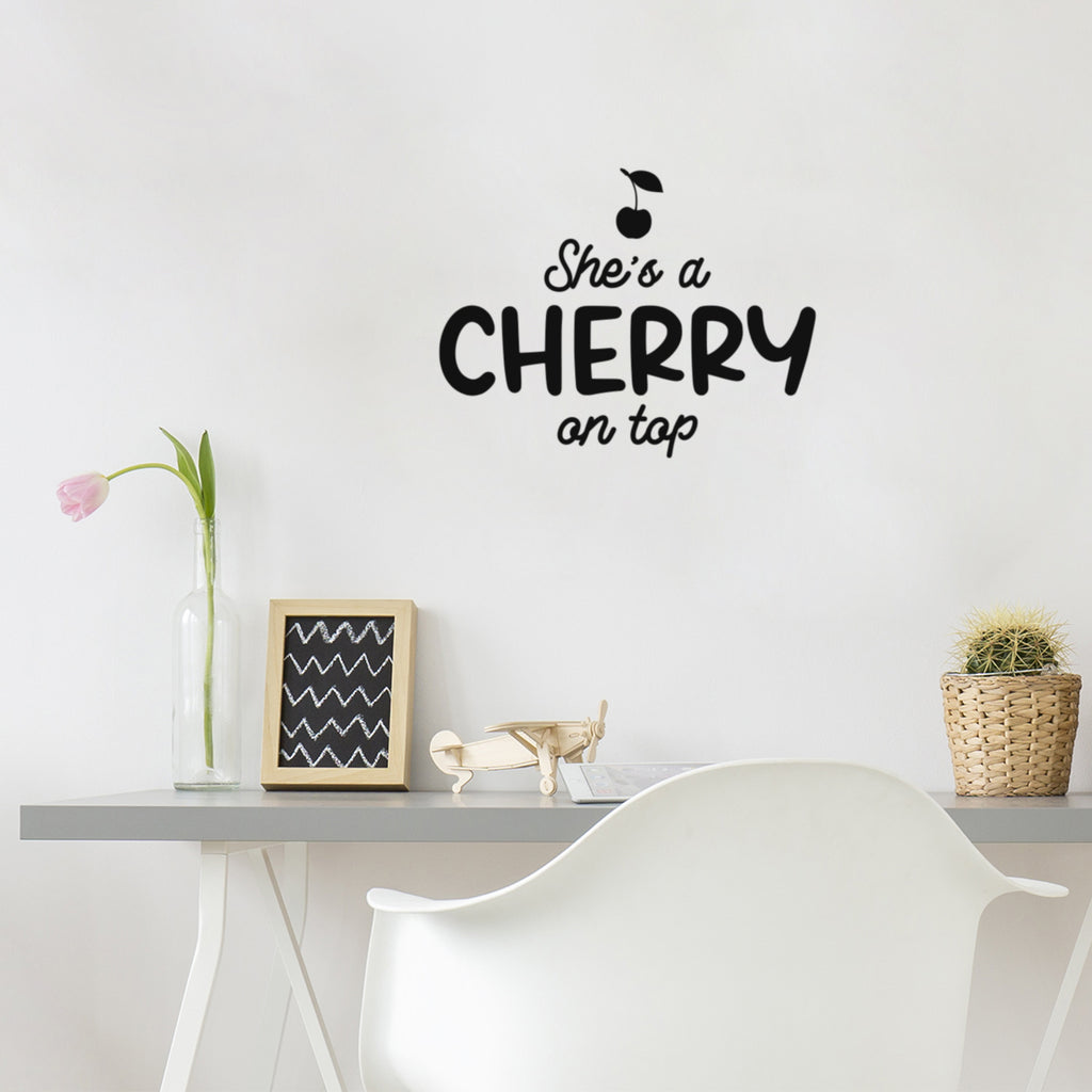 This awesome decal quote "She's A Cherry On Top"; is the perfect touch for your home or work. Use it for your dorm room; home office or anywhere you want to bring some extra decoration. It's a vinyl sticker that is easy to put on any smooth and dry surface. Our modern designs don't just brighten up the room; but brighten up the day. Using top of the line vinyl across all of our production allows us to be the leaders in quality and design.