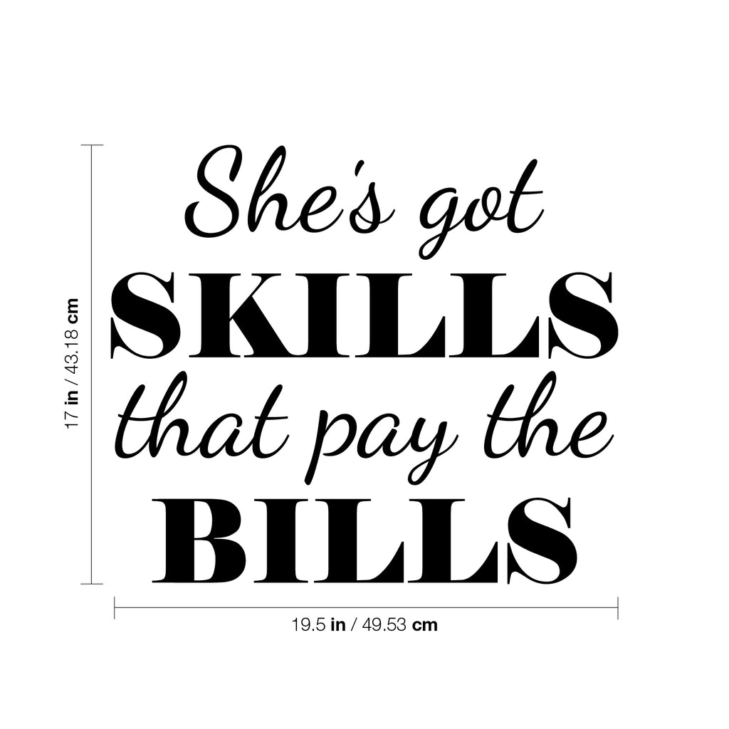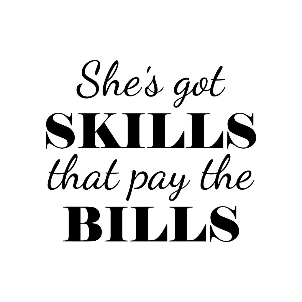 This empowering decal quote "She's Got Skills That Pay The Bills"; is the perfect touch for your home or work. Use it for your dorm room; home office or anywhere you want to bring some extra decoration. It's a vinyl sticker that is easy to put on any smooth and dry surface. Our modern designs don't just brighten up the room; but brighten up the day. Using top of the line vinyl across all of our production allows us to be the leaders in quality and design.