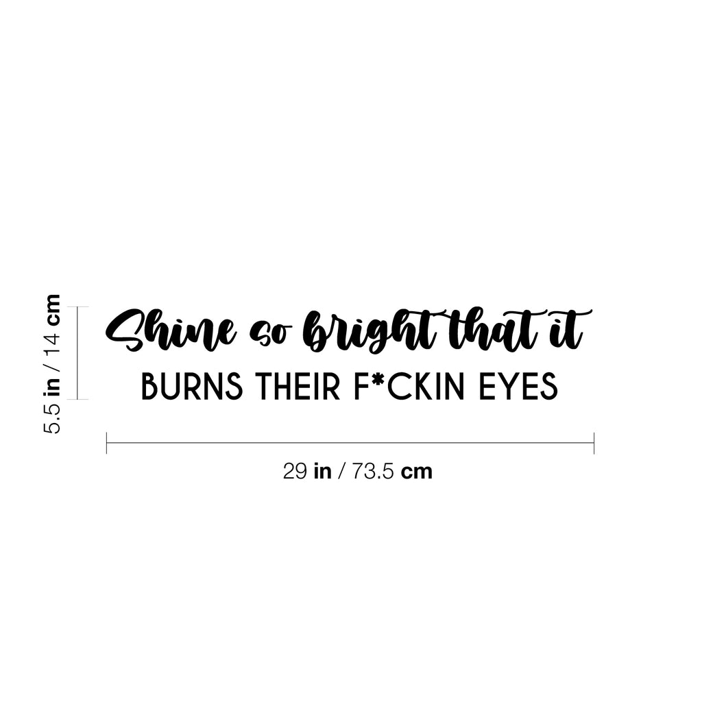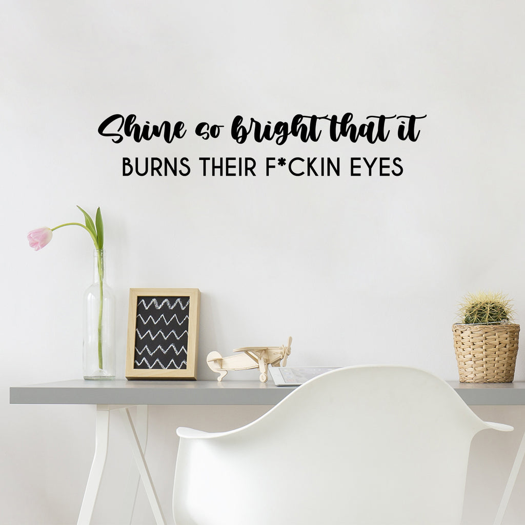 This awesome positive decal quote "Shine So Bright That It Burns Their F*ckin Eyes"; is the perfect touch for your home or work. Use it for your bedroom; closet; living room or anywhere you want to bring some extra positive decoration. It's a vinyl sticker that is easy to put on any smooth and dry surface. Our modern designs don't just brighten up the room; but brighten up the day. Using top of the line vinyl across all of our production allows us to be the leaders in quality and design.