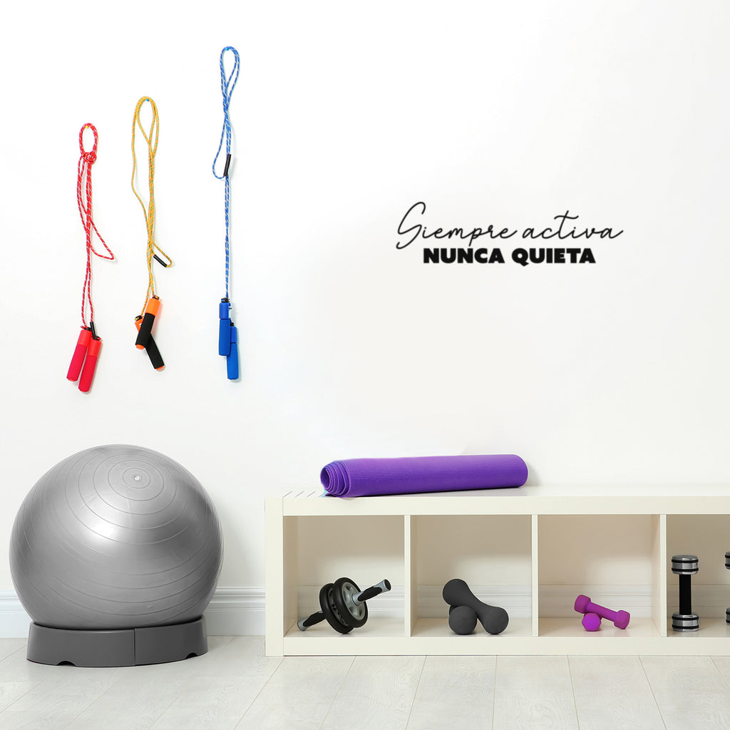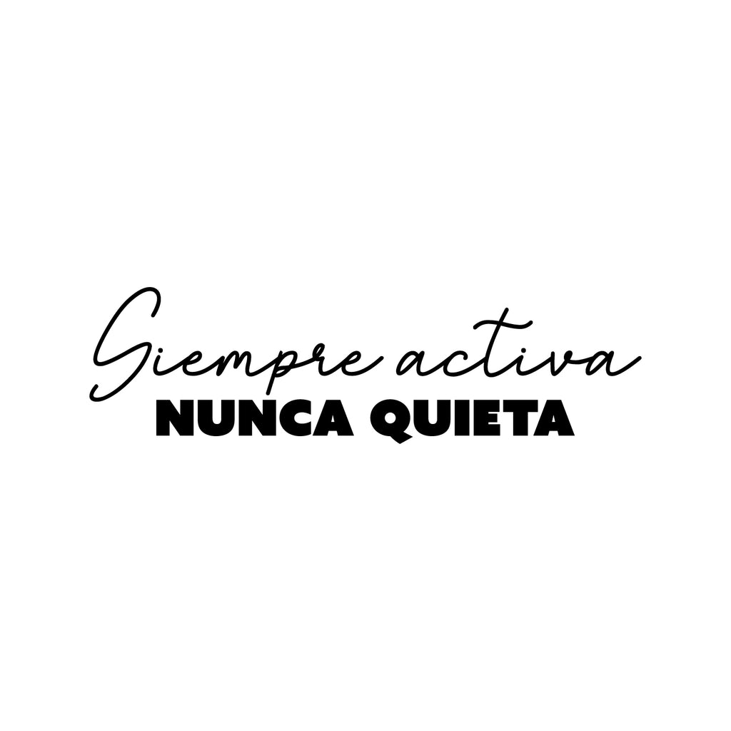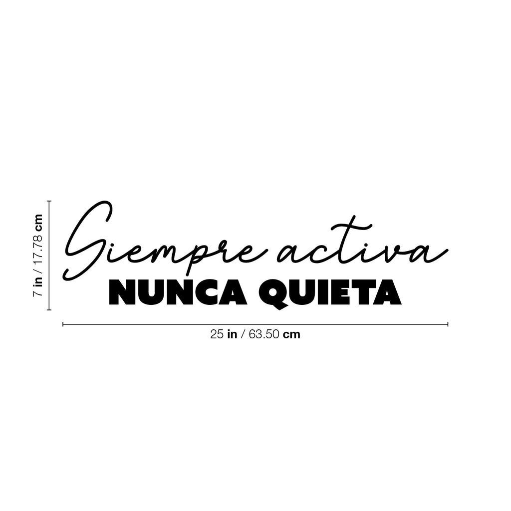 This awesome positive & motivational decal quote "Siempre Activa Nunca Quieta / Always Active Never Still"; is the perfect touch for your home or office. Use it for your living room; bedroom; class or anywhere you want to bring some positive decoration. It's a vinyl sticker that is easy to put on any smooth and dry surface. Our modern designs don't just brighten up the room; but brighten up the day. Using top of the line vinyl across all of our production allows us to be the leaders in quality and design.