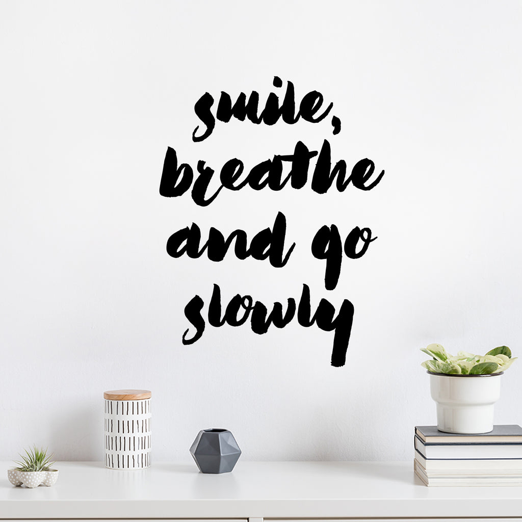 This awesome inspirational decal quote "Smile Breathe And Go Slowly "; is the perfect touch for your home. Use it for your bedroom; living room; storefront or anywhere you want to bring some extra cute decoration. It's a vinyl sticker that is easy to put on any smooth and dry surface. Our modern designs don't just brighten up the room; but brighten up the day. Using top of the line vinyl across all of our production allows us to be the leaders in quality and design.