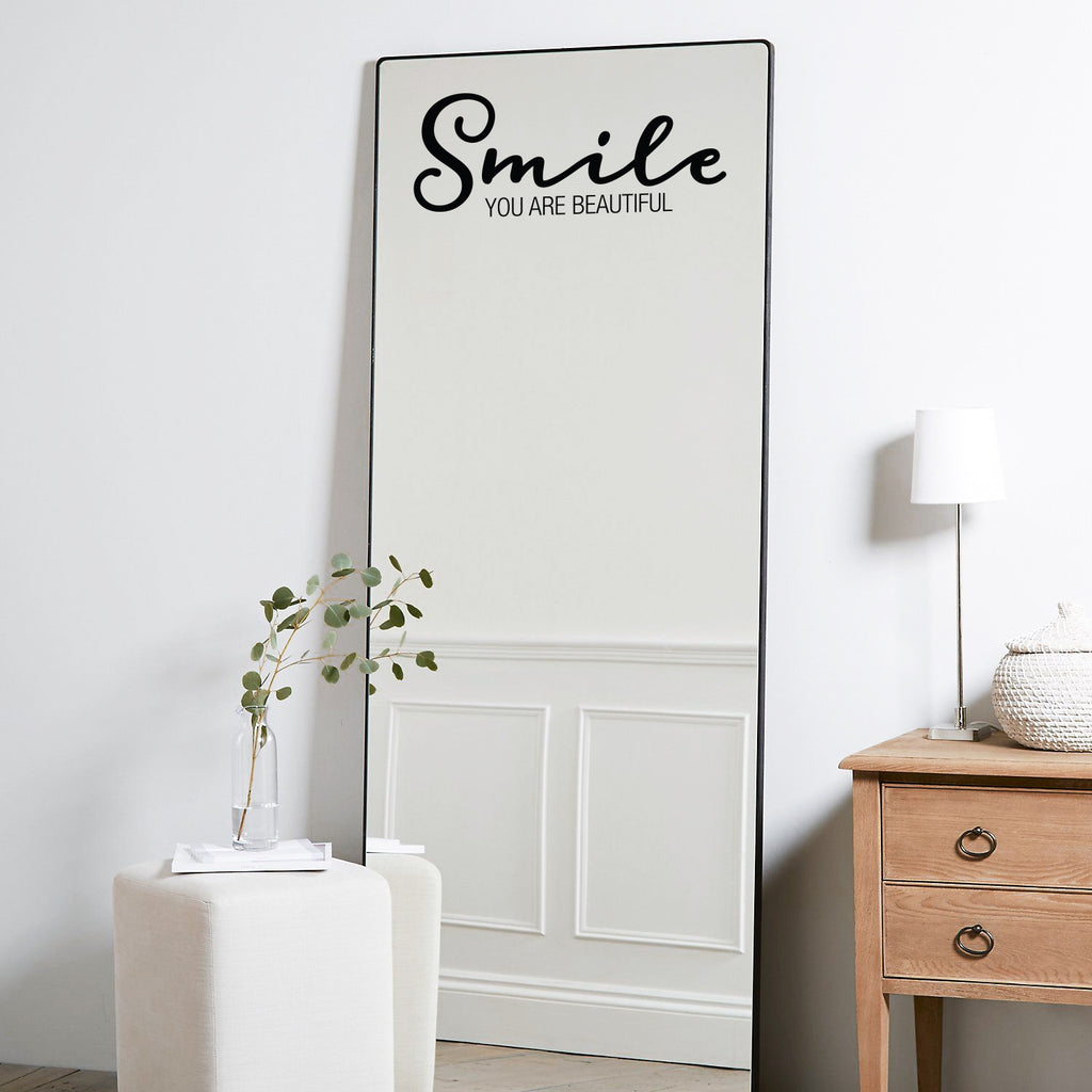 This great decal quote "Smile You Are Beautiful"; is the perfect touch for your home. Use it for your makeup area; dorm room or anywhere you want to bring some extra decoration. It's a vinyl sticker that is easy to put on any smooth and dry surface. Our modern designs don't just brighten up the room; but brighten up the day. Using top of the line vinyl across all of our production allows us to be the leaders in quality and design.