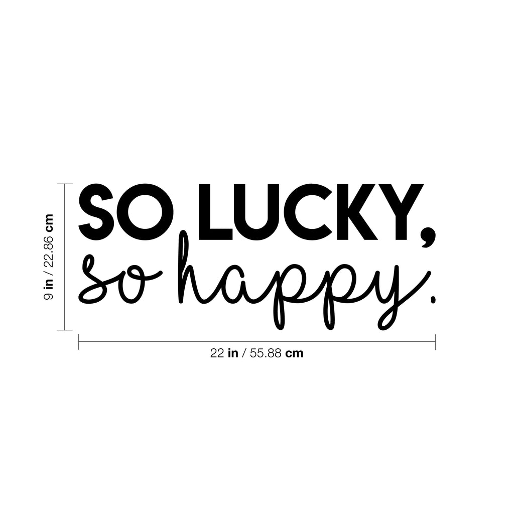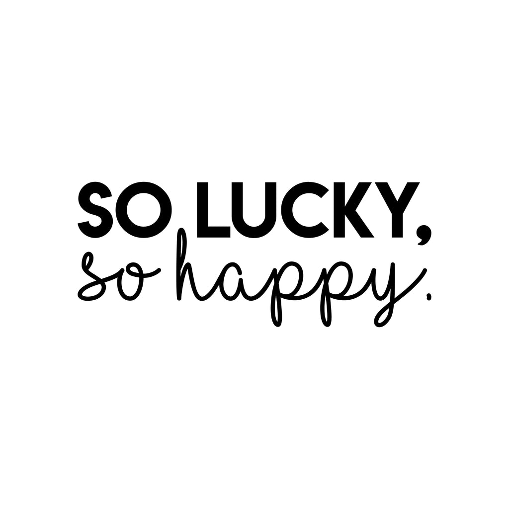 This awesome positive decal quote "So Lucky So Happy"; is the perfect touch for your home or work. Use it for your bedroom; playroom; living room or anywhere you want to bring some extra positive decoration. It's a vinyl sticker that is easy to put on any smooth and dry surface. Our modern designs don't just brighten up the room; but brighten up the day. Using top of the line vinyl across all of our production allows us to be the leaders in quality and design.