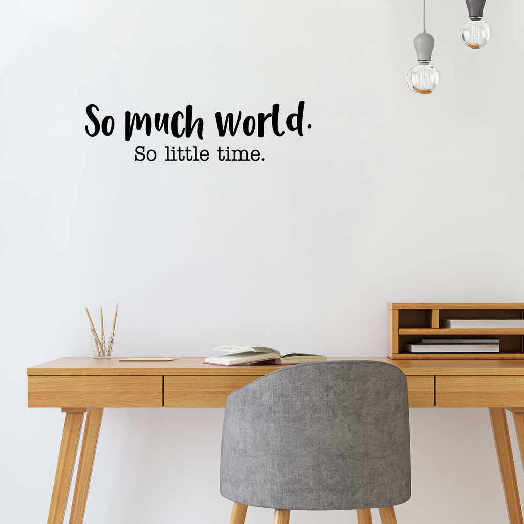 This awesome "So Much World So Little Time" wall art decal is modern and the perfect touch for your home. Use it for your bedroom; living room; travel agency or anywhere you want to bring some extra decoration. It's a vinyl sticker that is easy to put on almost any smooth and dry surface. Our modern designs don't just brighten up the room; but brighten up the day. Using top of the line vinyl across all of our production allows us to be the leaders in quality and design.