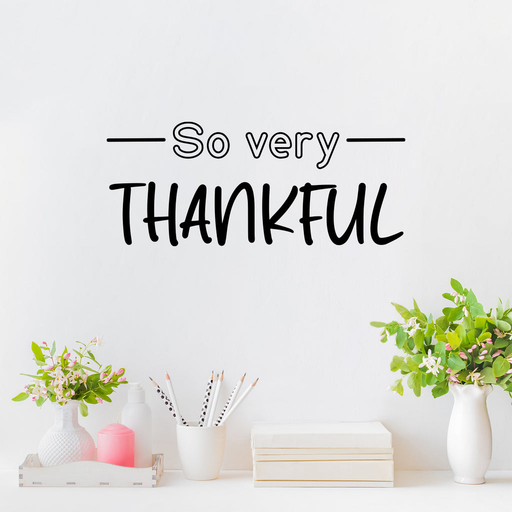 This optimistic & inspirational decal quote "So Very Thankful"; is the perfect touch for your home or office. Use it for your living room; playroom; dining room or anywhere you want to bring some extra cute decoration. It's a vinyl sticker that is easy to put on any smooth and dry surface. Our modern designs don't just brighten up the room; but brighten up the day. Using top of the line vinyl across all of our production allows us to be the leaders in quality and design.