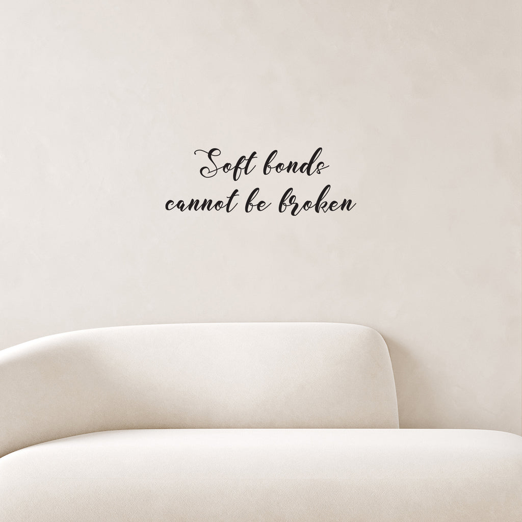 This cute & positive decal quote "Soft Bonds Cannot Be Broken"; is the perfect touch for your home or office. Use it for your bedroom; closet; living room or anywhere you want to bring some extra positive decoration. It's a vinyl sticker that is easy to put on any smooth and dry surface. Our modern designs don't just brighten up the room; but brighten up the day. Using top of the line vinyl across all of our production allows us to be the leaders in quality and design.