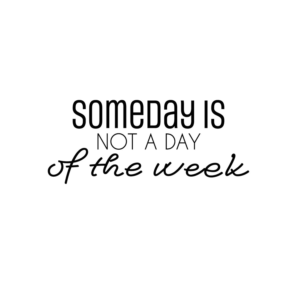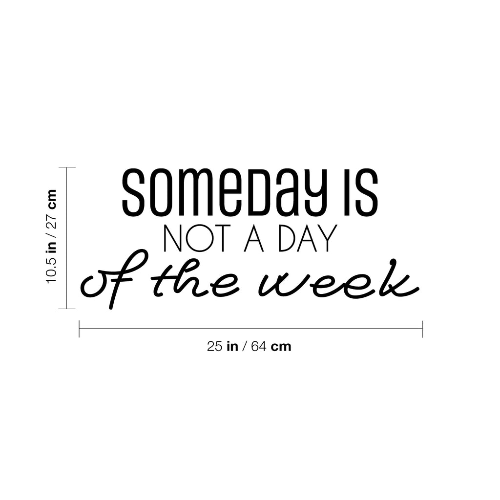 This optimistic decal quote "Someday Is Not A Day Of The Week"; is the perfect touch for your school or office. Use it for your living room; classroom; playroom or anywhere you want to bring some extra positive decoration. It's a vinyl sticker that is easy to put on any smooth and dry surface. Our modern designs don't just brighten up the room; but brighten up the day. Using top of the line vinyl across all of our production allows us to be the leaders in quality and design.