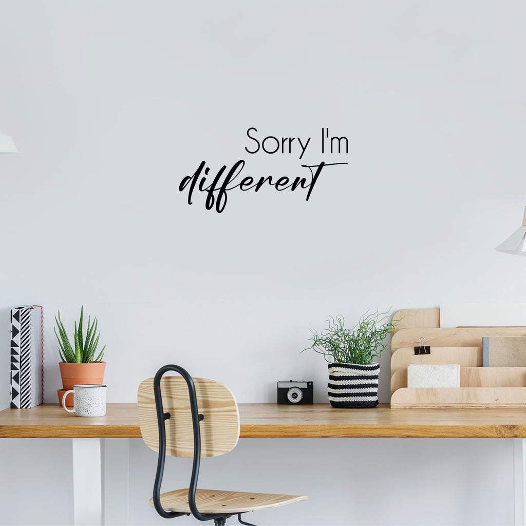 This awesome positive decal quote "Sorry I'm Different"; is the perfect touch for your home or office. Use it for your bedroom; closet; classroom or anywhere you want to bring some extra positive decoration. It's a vinyl sticker that is easy to put on any smooth and dry surface. Our modern designs don't just brighten up the room; but brighten up the day. Using top of the line vinyl across all of our production allows us to be the leaders in quality and design.