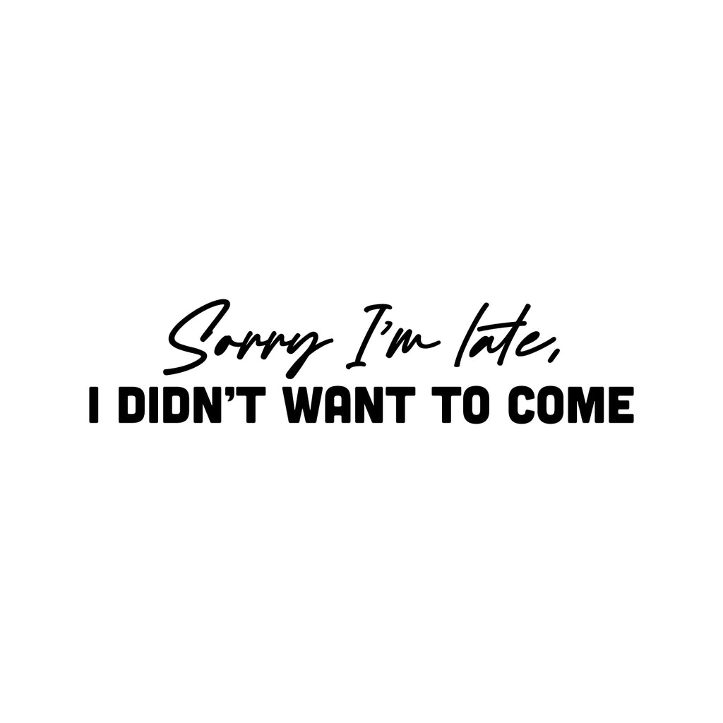 This decal quote "Sorry I'm Late I Didn't Want To Come"; is the perfect touch for your home or work . Use it for your office; living room or anywhere you want to bring some extra cute decoration. It's a vinyl sticker that is easy to put on any smooth and dry surface. Our modern designs don't just brighten up the room; but brighten up the day. Using top of the line vinyl across all of our production allows us to be the leaders in quality and design.